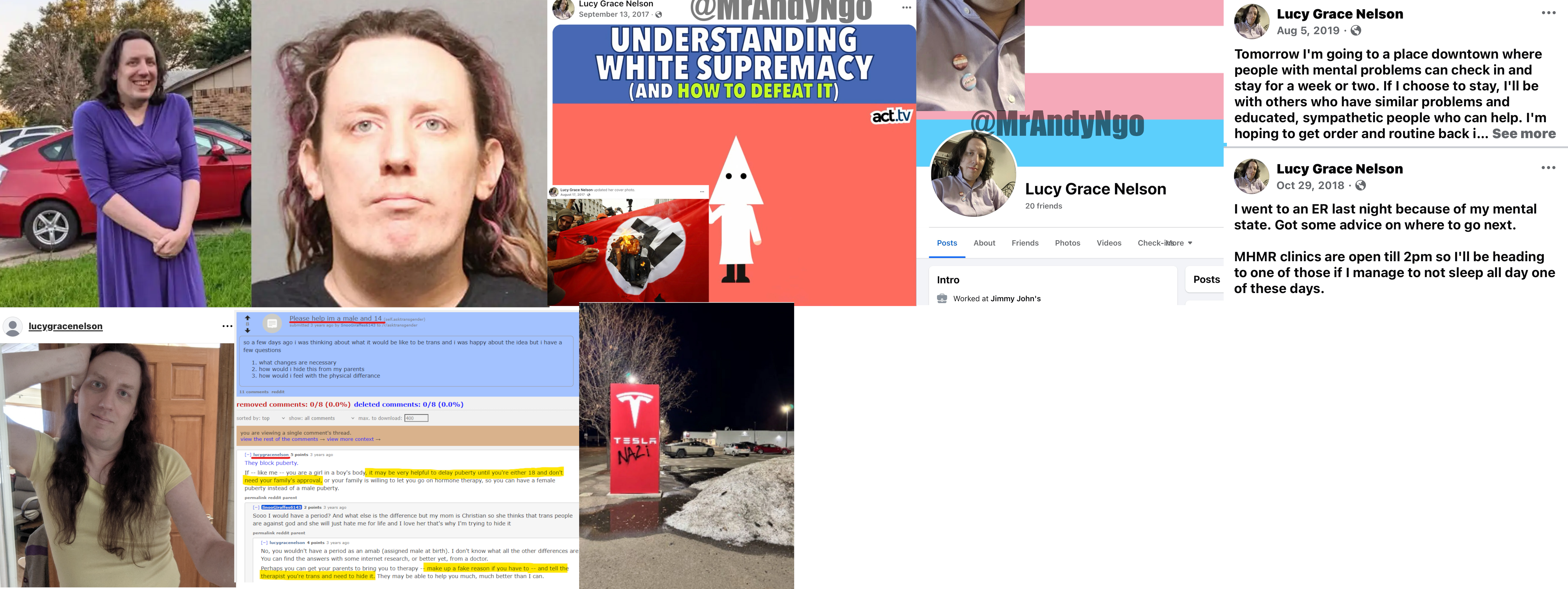 Lucy Grace Nelson, born Justin Thomas Nelson, is a biological male trantifa who firebombed and vandalized a Tesla dealership in Loveland, Colorado in early 2025. Prior to the arson, it vandalized the dealership and painted "Nazi" under the dealership's sign. Media outlets incorrectly reported its sex as "female". Nelson was charged with possession of an unregistered firearm as a destruction device and criminal attempt to commit a class-3 felony. Nelson communicated with and possibly groomed a 14 year old boy on Reddit, telling the boy to lie to a therapist to obtain puberty delaying drugs. It posted a lot about fighting "fascism" and "white supremacy" on social media prior to its arrest. Nelson refers to itself as "baby" and appears to be proud it worked at a Jimmy John's sandwich shop. It's probably mentally ill and has posted about seeking mental treatment on FB. Nelson's age has been variously reported as 40 or 42. It lived in Lyons prior to its arrest. https://archive.ph/EL458, https://archive.ph/zVOFu