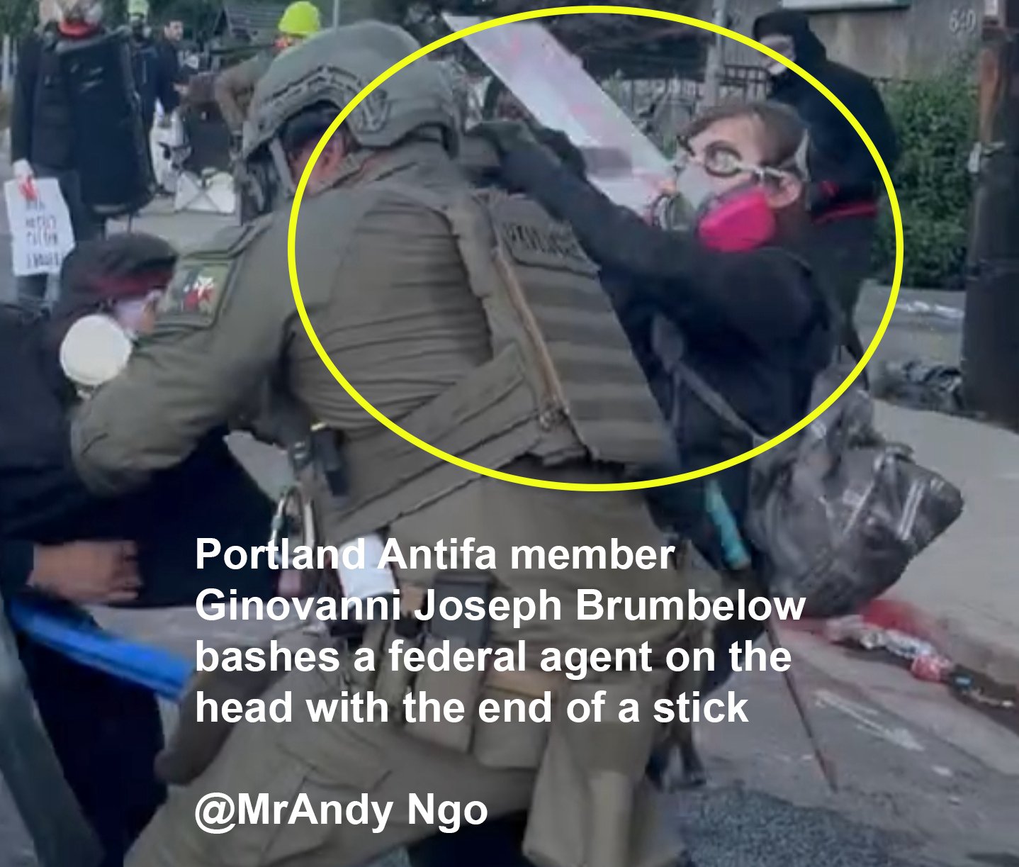 According to reporting by Andy Ngo, Ginovanni Joseph Brumbelow, slammed a stick over a federal officer's head. He faces up to eight years in prison. https://www.justice.gov/usao-or/pr/gresham-man-charge-assaulting-federal-law-enforcement-officer-during-weekend-riot-near