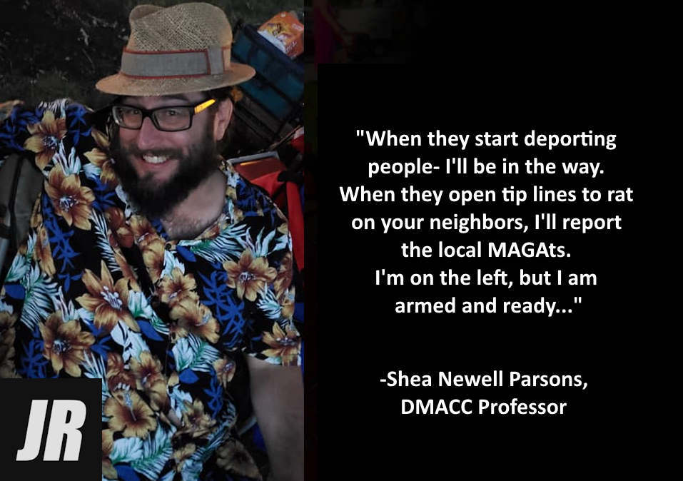 Shea Newell Parsons is a diesel mechanic professor at Des Moines Area Community College (DMACC). He has called for the murder of right-wing activists and refers to republicans, christians, conservatives, and other non-progressive groups as mentally deficient and evil. Parsons is active on Reddit, where he has aired many unhinged threats, as first covered by the Justice Report. He calls himself an antifascist and claims he is armed and ready to fight back against Trump and the country's so-called slide into "fascism." He claims he has worked on hiring committees for the trucking and diesel repair industries and can make or break people's careers in the field. https://justicereport.net/2025/02/27/antifa-professor-at-iowa-college-linked-to-violent-social-media-threats/