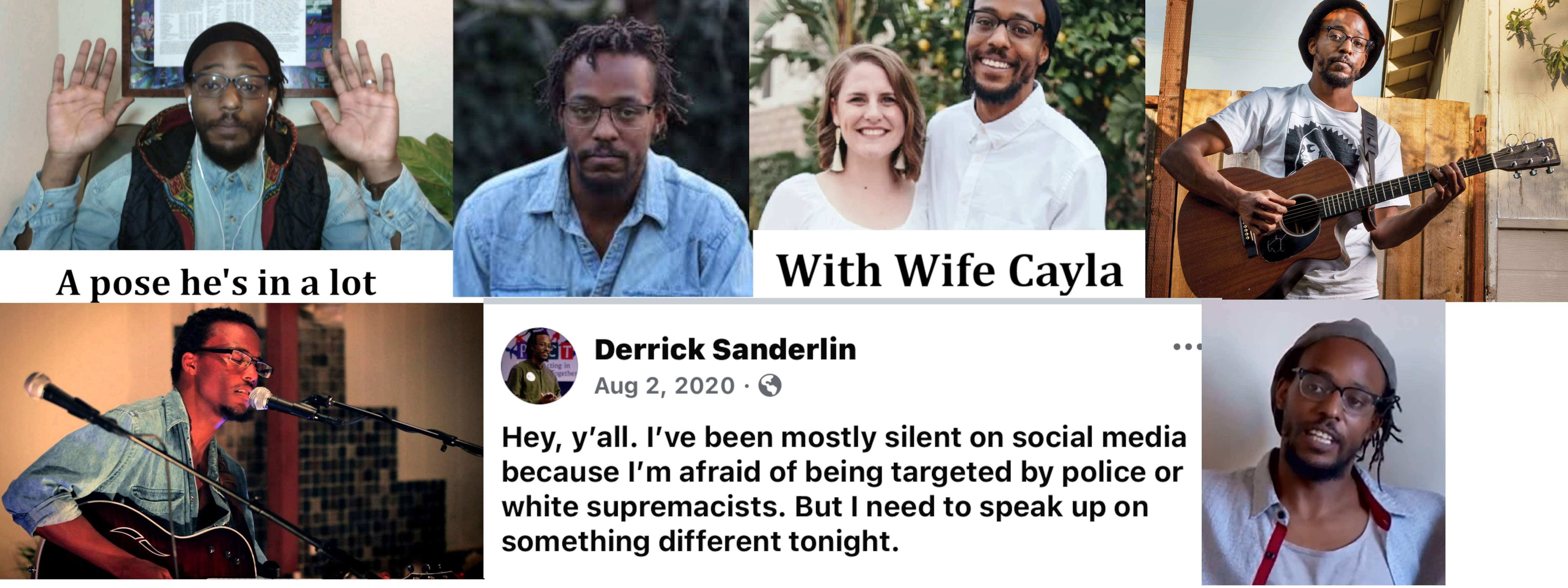 Derrick Acan Sanderlin, born Jul. '92, participated in a George Floyd riot in May 2020 in San Jose with his wife Cayla. His wife wanted to leave but he forced her to stay. He positioned himself as a human meat shield between two rioters holding paint cans and the police. An officer ordered Sanderlin to move, warning him he would be shot if he didn't comply. Sanderlin ignored the order and was hit in the groin by non-lethal ammo. Although the ammo was non-lethal, it was nearly lethal to his nuts and he underwent emergency surgery on a ruptured testicle. Doctors later broke the news to him that he may not be able to have children. Sanderlin sued the city and settled out of court. Sanderlin formerly worked as a community organizer but now works as a barista. He also volunteers with a team that provides procedural justice and implicit bias training to classes at the San Jose Police Department Academy. He's an amateur musician who wrote and performed a song titled "Bomb Threat". Sanderlin has a few priors but the offenses aren't listed and are probably minor. https://archive.ph/anoOr#selection-761.149-761.166, https://archive.ph/diDd7 https://www.documentcloud.org/documents/25104080-officer-crotch-shot/ https://www.youtube.com/watch?v=C7bBhGZv2B0&ab_channel=ThePress-Enterprise (His song)