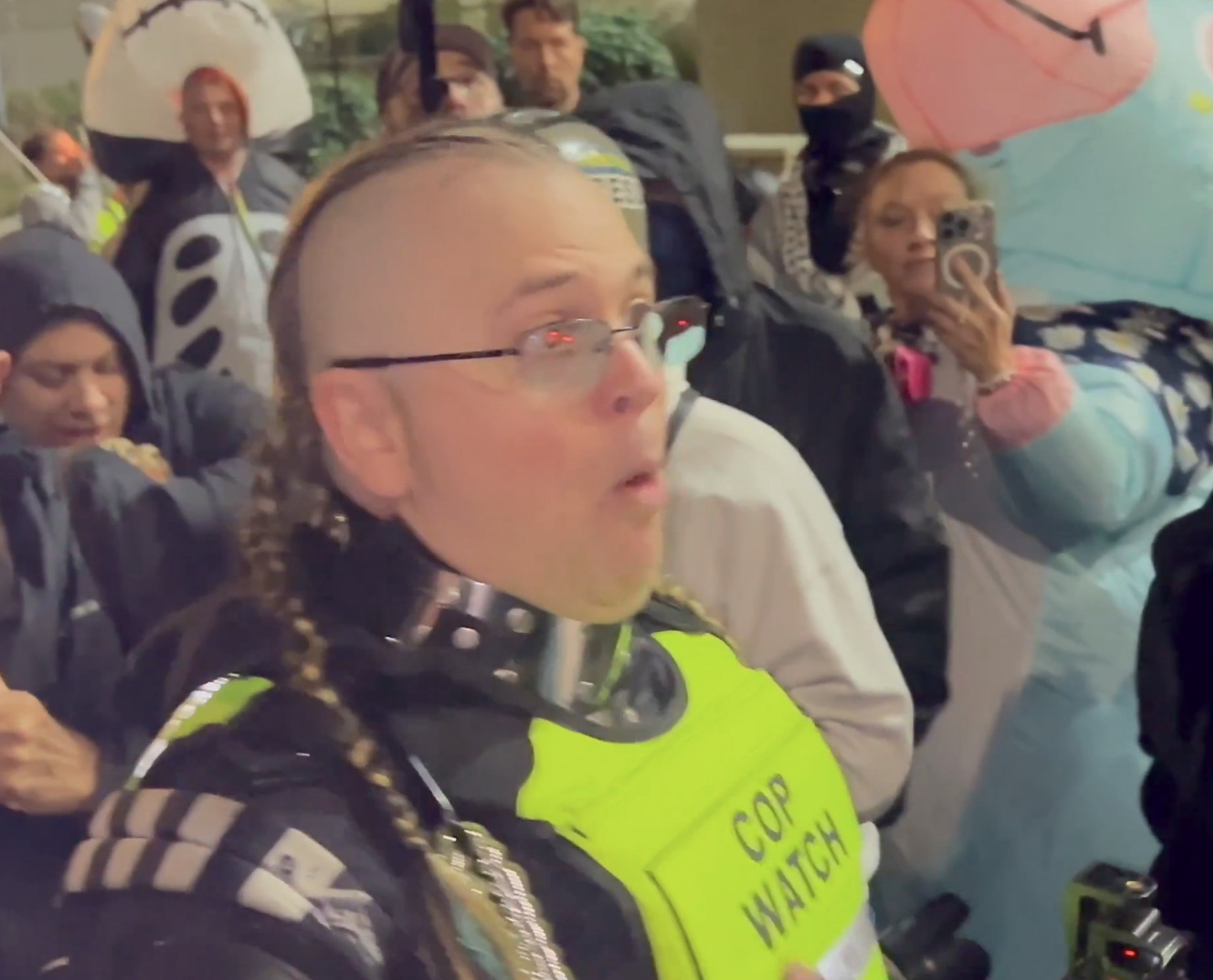 https://x.com/AntifaWatch2/status/1979425703012819382 https://daylightdisinfectant.com/occupier-who-assaulted-journalist-identified/ Carleton Ray Smith aka "Mike Blue Hair". He has been active with Portland Antifa connected groups for more than a decade with Occupy & other groups. Back in 2014 he assaulted an independent journalist to prevent him filming Antifa vandalizing Multnomah County Probation Office. Video from that event https://youtube.com/watch?v=s1ELQgq01r8 Carleton also got arrested during a August 2020 George Floyd riot https://archive.vn/gkWrB Popped back up in 2025 screaming at a conservative in front of the ICE facility.