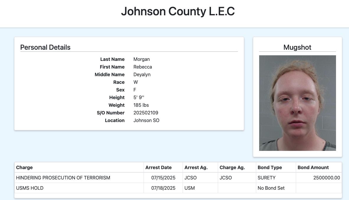 https://www.nbcdfw.com/news/local/fbi-arrests-prairieland-shooting-suspect-after-11-day-manhunt-in-dallas/3886350/ Arrested in relation to Benjamin Song Antifa shooting at ICE facility in Alvarado TX "Rebecca Morgan was arrested on Tuesday for aiding and abetting a fugitive". Booked or "HINDERING PROSECUTION OF TERRORISM" and a federal US marshall hold