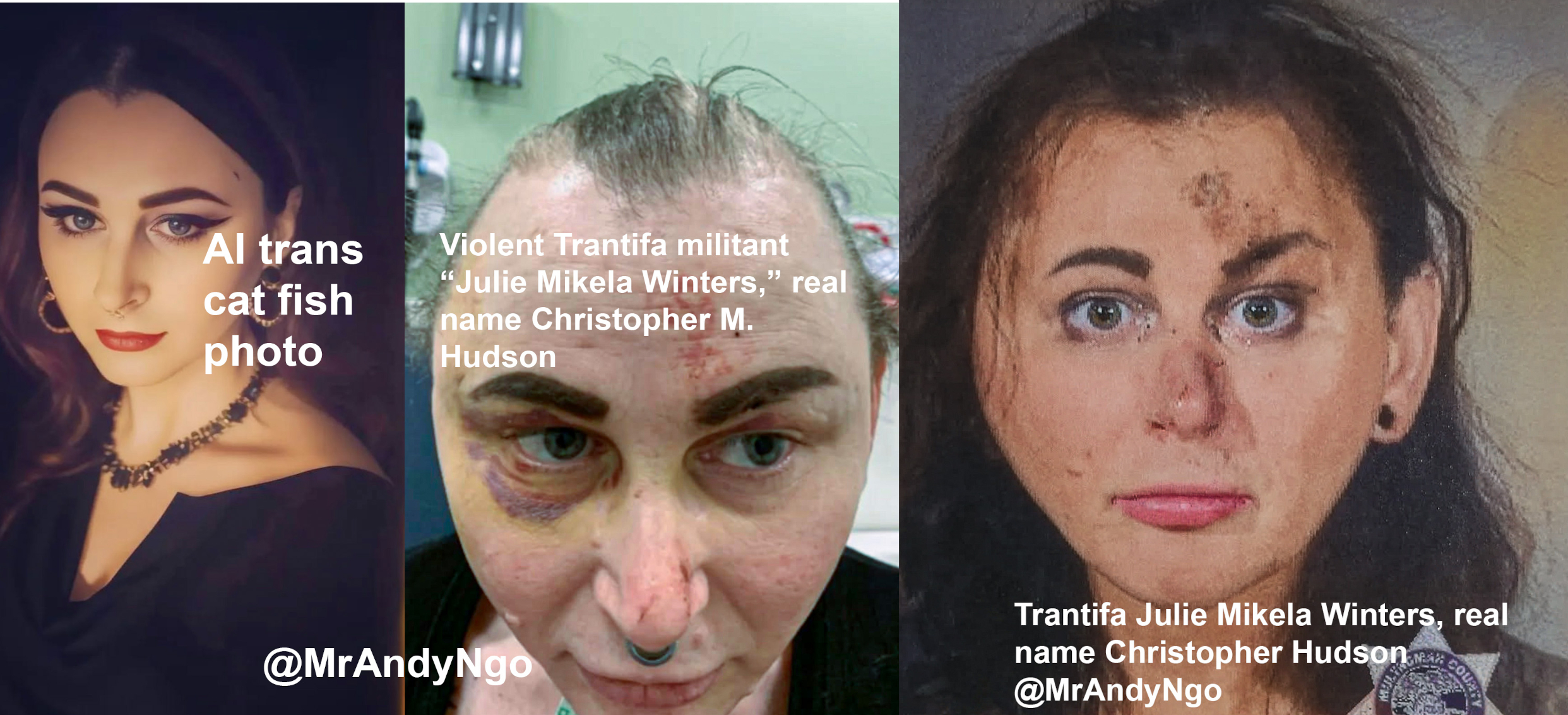 Aka "Julie Mikela Winters", born Sep. '78. According to reporting by Andy Ngo, it's a tranifa who is accused of trying to light an incendiary device next to the Portland ICE facility in June 2025 and then threatening responding officers with a machete. It then allegedly threw the blade at the face of an officer, but he dodged. Despite the fact it's a biological male, the woke PPD booked Hudson as a "female" and held it in the women's' cell block. Hilariously, it posted a glamor cat-fishing photo of itself on some social media site looking very trim despite the fact it weighs 250 lb. https://archive.ph/JAdQP, https://archive.is/knoPT
