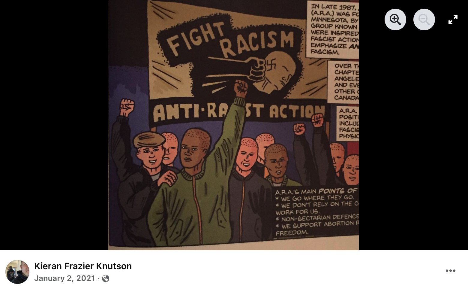 Kieran Knutson and Anti-Racist Action: https://www.facebook.com/kieranfk Kieran Knutson is a long-time Minneapolis activist who was involved with the Anti-Racist Action network in the late 1980s. He is on the record discussing his time in the 1980s when the Baldies, an antifa skinhead group. Knutson's role as a union official More recently, in 2022, Knutson was identified as the president of Communications Workers of America (CWA) local 7250. In this role, he offered his perspective on a Minneapolis Police Department report on political extremism, dismissing the MPD's analysis of antifa as superficial.