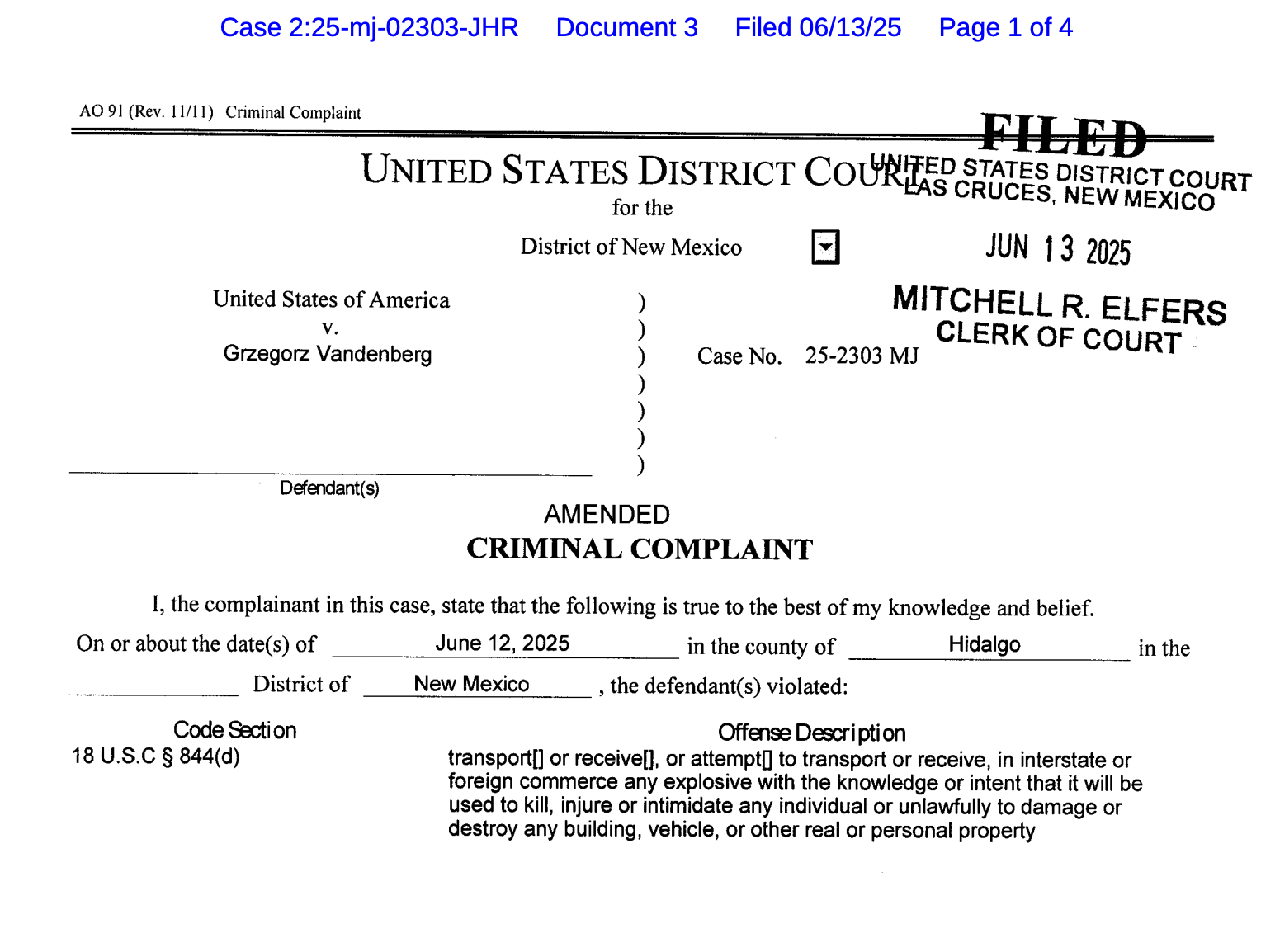 Vandenberg is a Texas man who purchased six mortar fireworks and 36 large fireworks at a stand in New Mexico. He told store employees he had special forces training and could make a pipe bomb. He also disclosed he was traveling to Los Angeles with the intent of killing law enforcement officers. He invited employees to join hims and his "platoon" in California, so there could be more like him in L.A. Police arrested Vandenberg in Arizona. https://web.archive.org/web/20250623163109/https://ktar.com/arizona-news/arrested-in-arizona-fireworks/5719327/