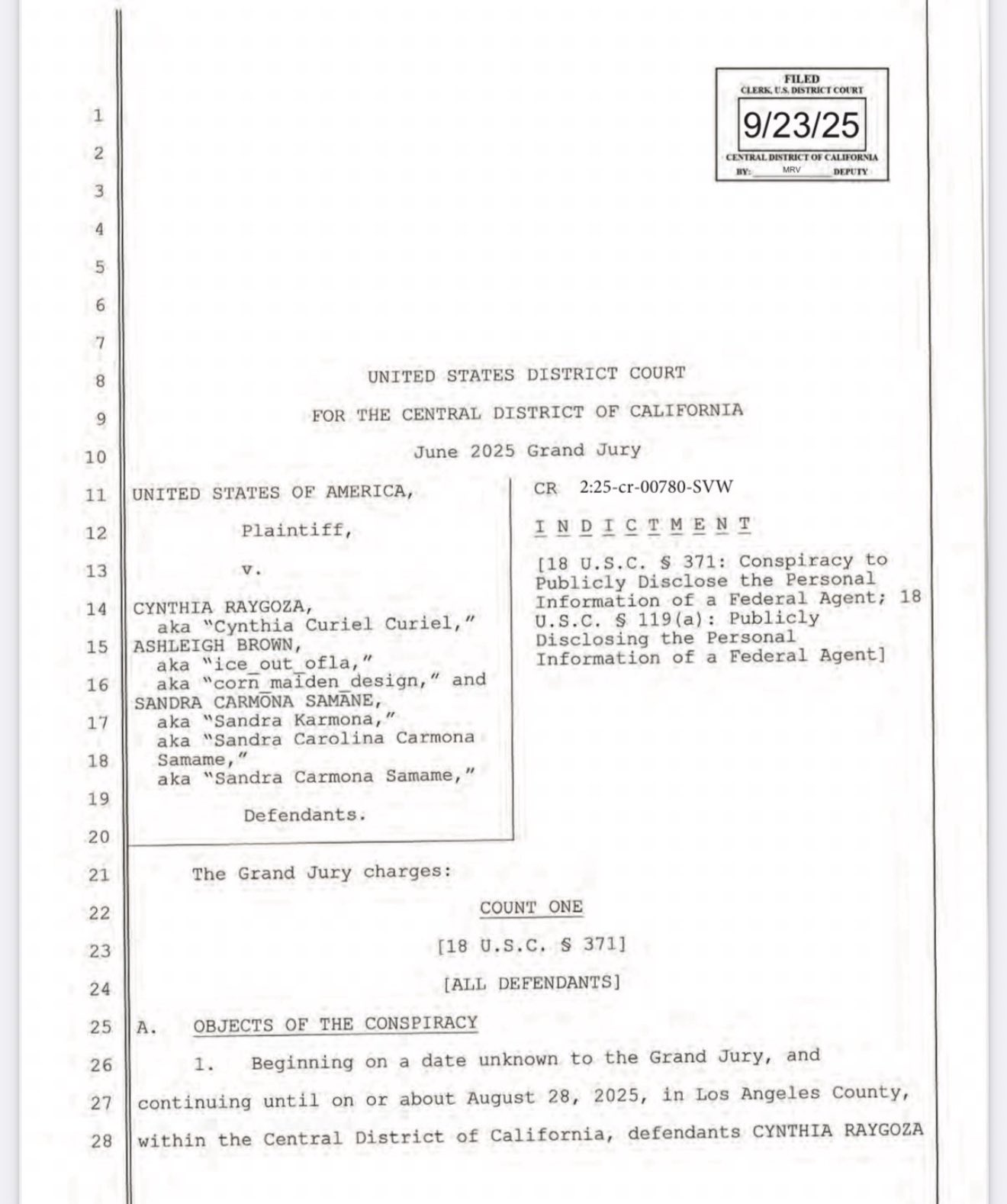 https://www.justice.gov/usao-cdca/pr/federal-grand-jury-charges-three-women-following-ice-agent-home-work-and-livestreaming Left wing doxxer in LA, tried to incite violence against ICE agent by distributing his address. Cynthia Raygoza, 37, of Riverside;