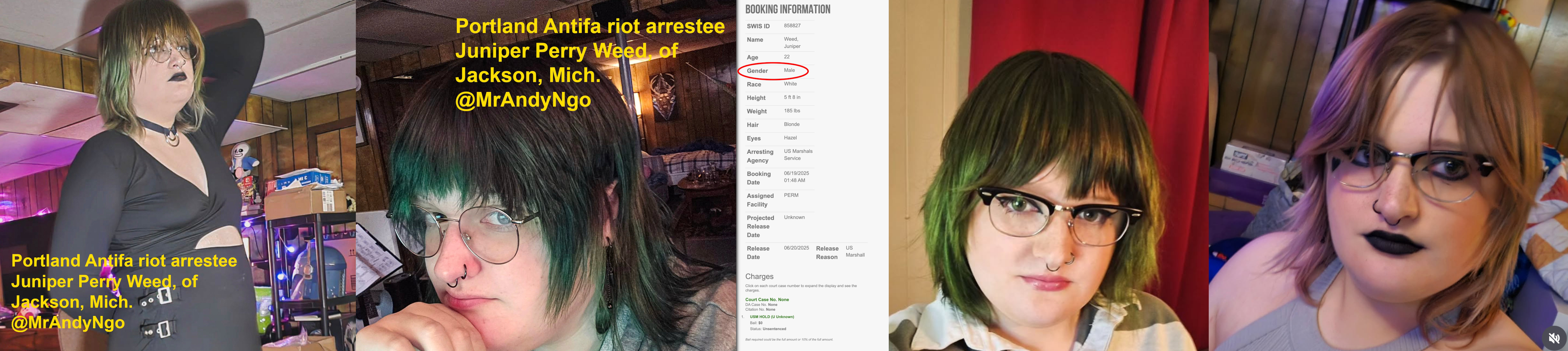 Juniper Perry Weed is a tranny who traveled from Michigan to Portland to riot over illegal alien deportations. It was accused of injuring an office while attempting to resist arrest. Police reports listed Weed as a man which must have pissed it off. Wick lives in Jackson, Michigan. https://x.com/MrAndyNgo/status/1936541602773659833 https://archive.is/a8nWH