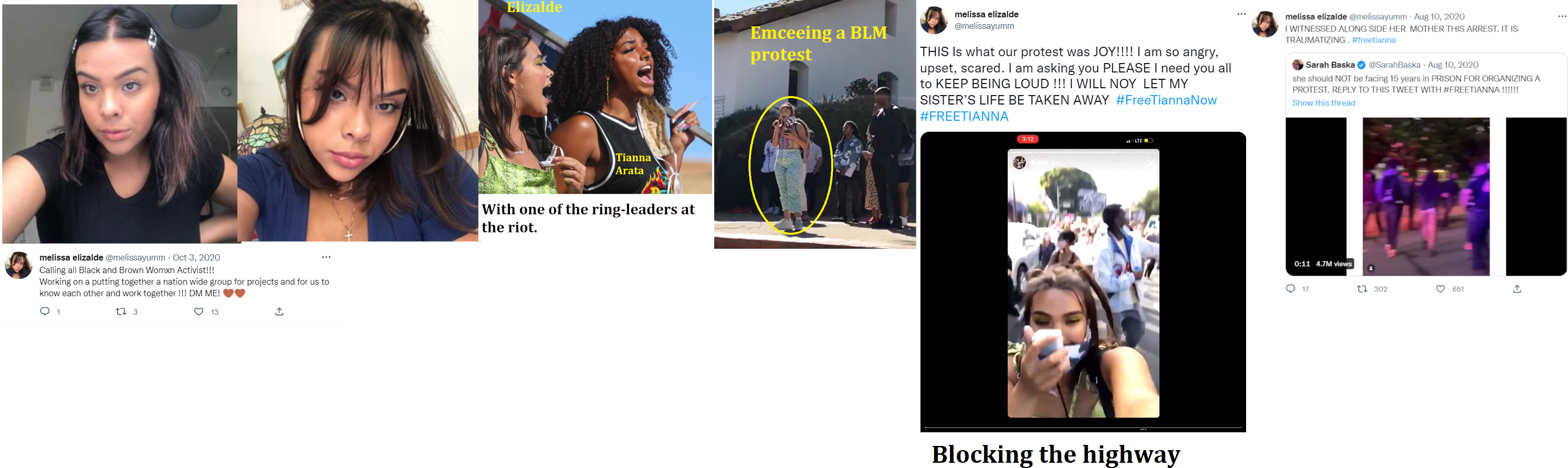 She participated in a violent protest in San Luis Obispo where rioters blocked a highway and smashed the windows of a car carrying a toddler. Elizalde claimed rioters broke the car's windows after the car ran into the mob, but police and news reports tell a different story. She hung out at the riot with her best friend Tianna Arata (https://antifawatch.net/ViewReport/340614b7), who was one of the ringleaders. Elizalde was the master of ceremonies at a BLM protest in San Luis Obispo in June 2020. Elizalde has a bachelor's degree in post-colonial studies from Emerson College and works as a marketer for a law firm. She may be from the Philippines where she attended high school. She's currently (2022) living in an apartment in Sacramento. https://archive.ph/0pzI6 https://www.facebook.com/R.A.C.E.MattersSLO/videos/student-organized-peaceful-protestrally-at-mission-plaza-slospeakersmelissa-eliz/189773155702832/