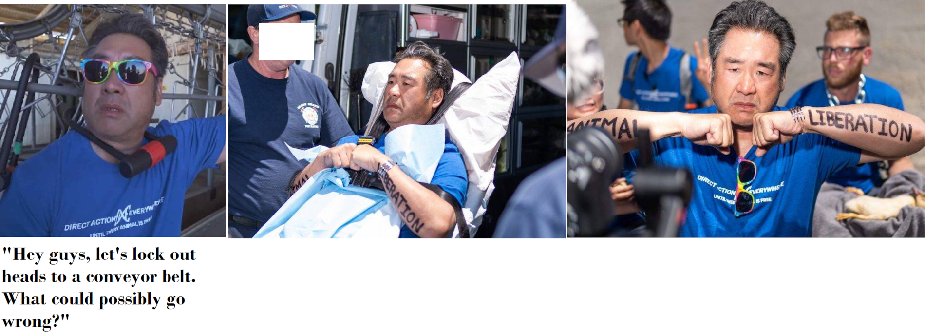 Chiang is an animal rights radical who was arrested at a 2019 protest at a duck farm in Petaluma California. He locked his head to a conveyor belt. Unfortunately for Chiang, someone switched the belt on, and he nearly lost his head. The belt was switched off before Chiang could earn DxE's first Darwin award. He was quoted as saying, "We have to escalate all of our actions because this is a global cirsis we're under." Chiang was arrested again in 2021 for blocking the entrance to a Foster Farms plant in Livingston, California. Chiang probably lives in the Bay Area. https://archive.ph/L0Q6D https://archive.ph/xeZ8l