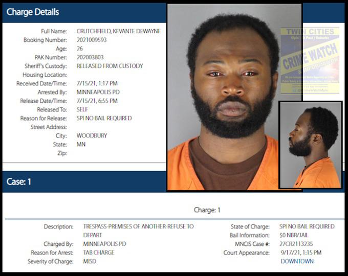 Kevante Dewayne Crutchfield, 26, Woodbury MN. One of the main radicalized, self-avowed communist agitators fomenting discord & havoc in #UptownMpls. Arrested on Thursday for trespassing at Seven Points parking garage, 31st/Girard Ave S. https://twitter.com/CrimeWatchMpls/status/1417532764182700034