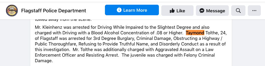 Taymond Tolthe, 24, of Flagstaff, was arrested on suspicion of burglary, criminal damage, obstructing a public thoroughfare, disorderly conflict, and other charges. He was also suspected of aggravated assault of an officer and resisting arrest. https://www.azcentral.com/story/news/local/arizona-breaking/2020/07/28/protest-leads-3-arrests-flagstaff-driver-exits-vehicle-gun/5523141002/