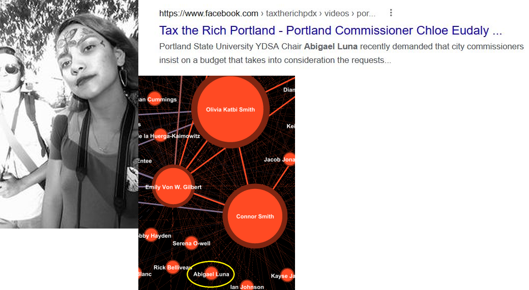 She's allegedly connected on social media to the Von Gilbert / Smith gang of Rose City Antifa. She ran the Young Democratic Socialists of America Portland State's Facebook group for a while in the late 2010s and she was also the group's co-chair. While at Portland State, she may have majored in Business. She may also have been a member of PSU's philosophy club. Luna appears to have been active in the Tax the Rich movement. Luna may be related to Cari Luna who's also connected to Von Gilbert and the Smiths. Otherwise, there's not much about her online. https://archive.vn/YmSAO