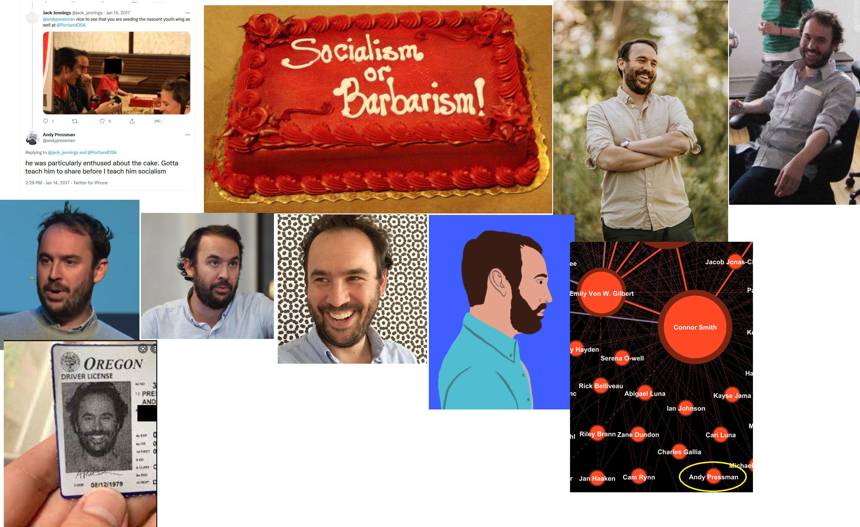 Andy Jacob Pressman (DOB: 08/12/79) is allegedly connected on social media to the Von Gilbert / Smith crew of Rose City Antifa. He's a graphics arts professor at Portland State. He also runs a design studio in Portland. Pressman brought his young son to a party celebrating the official charter of the Portland DSA in 2017 (there's been a small, uncharted DSA in Portland for years). He's Jewish and a member of the Jewish Solidarity Caucus who signed a letter in support of radical Islamic Congresswoman Ilhan Omar in 2019. Pressman has a BFA from Cooper Union College in New York. https://archive.vn/H566h https://archive.vn/NdxnI#selection-549.0-382.167
