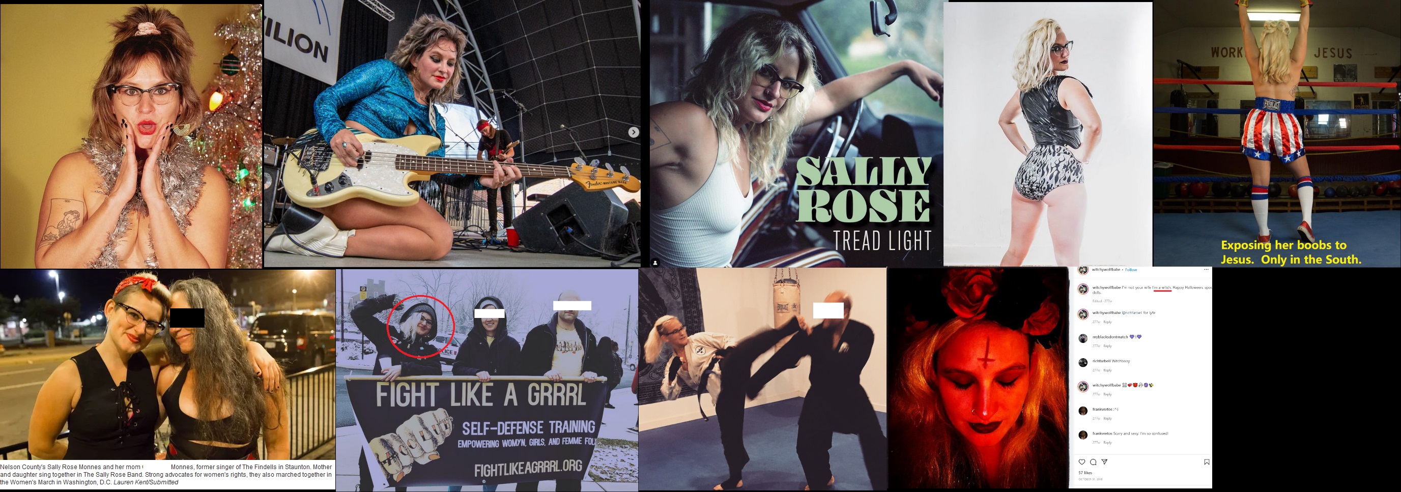 Sally Rose Monnes, AKA "Sally Rose" (DOB: 06/23/91) attended the Charlottesville Unite the Right counter protest. She also participated in the Women's March on Washington. She played bass for the band Shagwuf but may have started her own band. She's also a martial artist and started a business called Fight Like A Grrrl Club LLC. She's probably a witch. She has a few photos that indicate as much. Monnes lives out in the country at her father's house. https://archive.is/DMieW#selection-305.117-305.127 https://archive.vn/UY19s