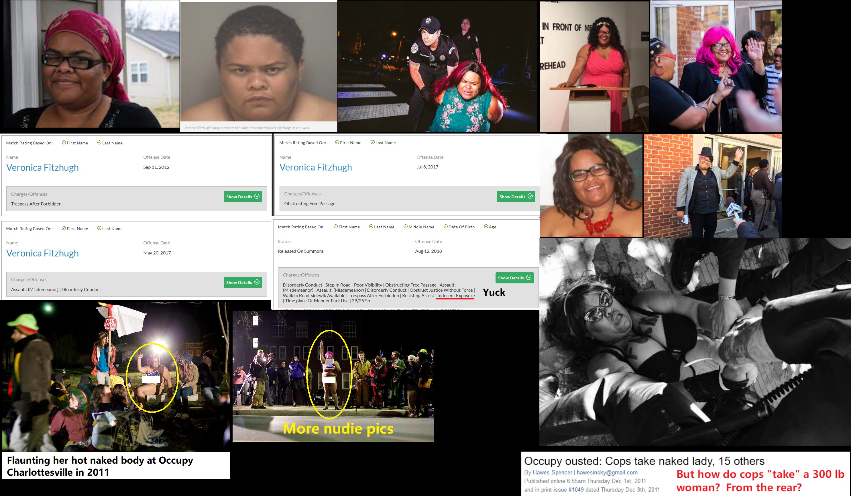 Veronica Haunani Fitzhugh (DOB: 09/13/78) is a mentally ill person who attacked a man saluting a Stonewall Jackson statue at the 2018 Charlottesville anniversary protest. It's unknown if she attended the original 2017 Unite the Right rally. Fitzhugh attacked Jason Kessler at an earlier statue rally in May 2017. She yelled at and pushed a person taking pictures of the Lee statue in Charlottesville the next day and was arrested again. She was previously arrested at a 2011 Occupy Charlottesville protest for stripping naked which is really gross because she weighs about 300 lb. Fitzhugh also has numerous other arrests or citations for misdemeanors and traffic violations. She declared personal bankruptcy in Florida in 2004. She's certified bi-polar. Fitzhugh moved back to Virginia and was hospitalized numerous times for mental health issues. Her mental health problems apparently qualified her to work as a life coach which she did for several years. She seems to have moved to upstate New York near Ithaca but may still have ties to an address in Charlottesville. She holds a BA in English from the University of Virginia and works as a writer and editor. https://archive.is/ZYNcI, https://archive.is/EikDd, https://archive.is/6RDkP, https://archive.is/OgCe9 https://archive.is/TExpD#selection-681.0-681.17