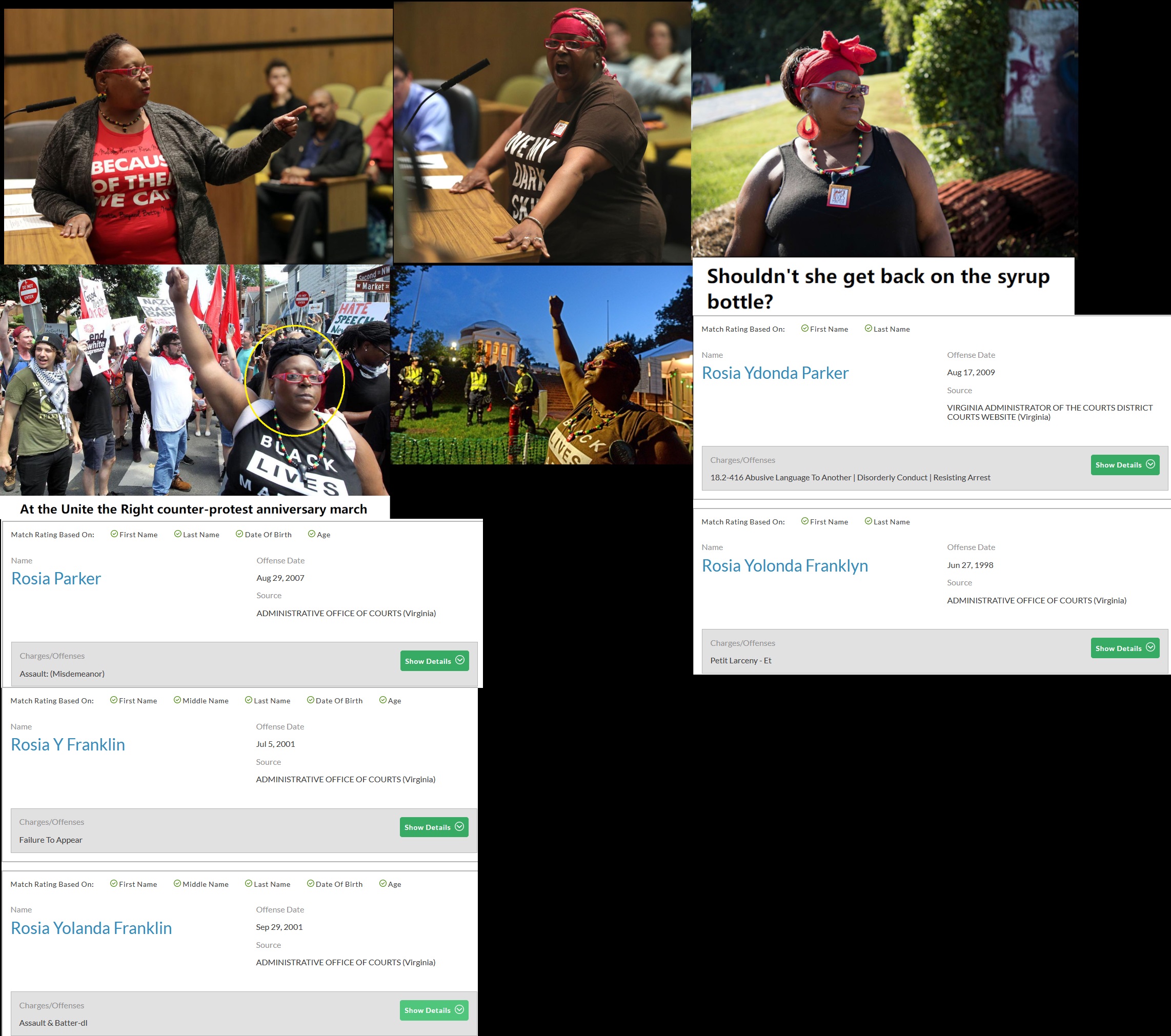 Rosia Yoland Parker, former name Rosia Franklin, (DOB: 04/29/72) is a BLM activist who was at the 2017 Unite the Right counter-protest. Parker claims to have witnessed the car incident and that is gave her mental problems. She was also seen at the anniversary protest in 2018. Parker claimed to be a UVA student in 2017 but she seems to be a bit old to attend college. She's had numerous run-ins with the law including arrests for assault and battery, assault, petit larceny, abusive language, resisting arrest, failure to appear and disorderly conduct. She lives in a dumpy looking apartment complex, probably public housing, in Charlottesville. https://archive.vn/ker2s https://archive.vn/mAn7f#selection-1121.0-1121.12
