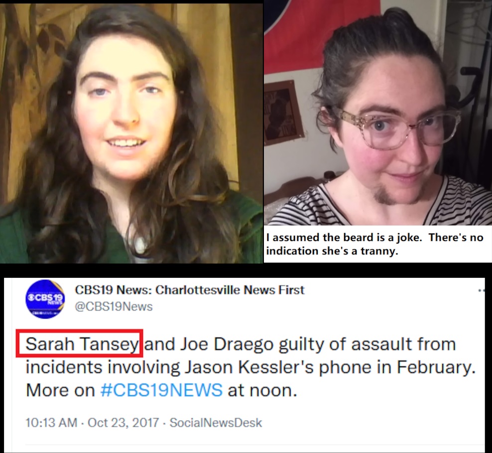 Sara Michel Tansey (DOB: 04/28/88) attended the Charlottesville Unite the Right counter-protest. Tansey posted a YT video of her arrest at a protest in 2015 but it's unclear where she was arrested and what the charges were. She was arrested at a 2017 Charlottesville city council meeting disrupted by radical protesters. The local CBS news station reported she was convicted of assault in the incident which involved alt-right celebrity Jason Kessler's phone. She lives in a nice rental house in Charlottesville. She's originally from South Carolina and attended the University of South Carolina. https://archive.vn/CKYS9 https://www.youtube.com/watch?v=XaSdyEP55zk&ab_channel=saratansey