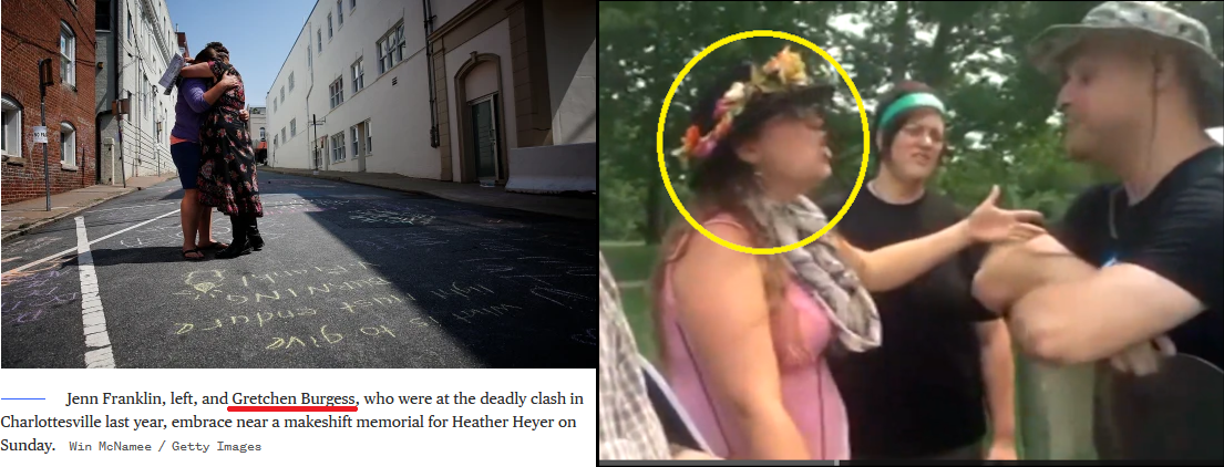 Burgess attended the Charlottesville Unite the Right counter protest and confronted an alt-right member. She claimed she was assaulted by the protester. https://archive.vn/qQxp3