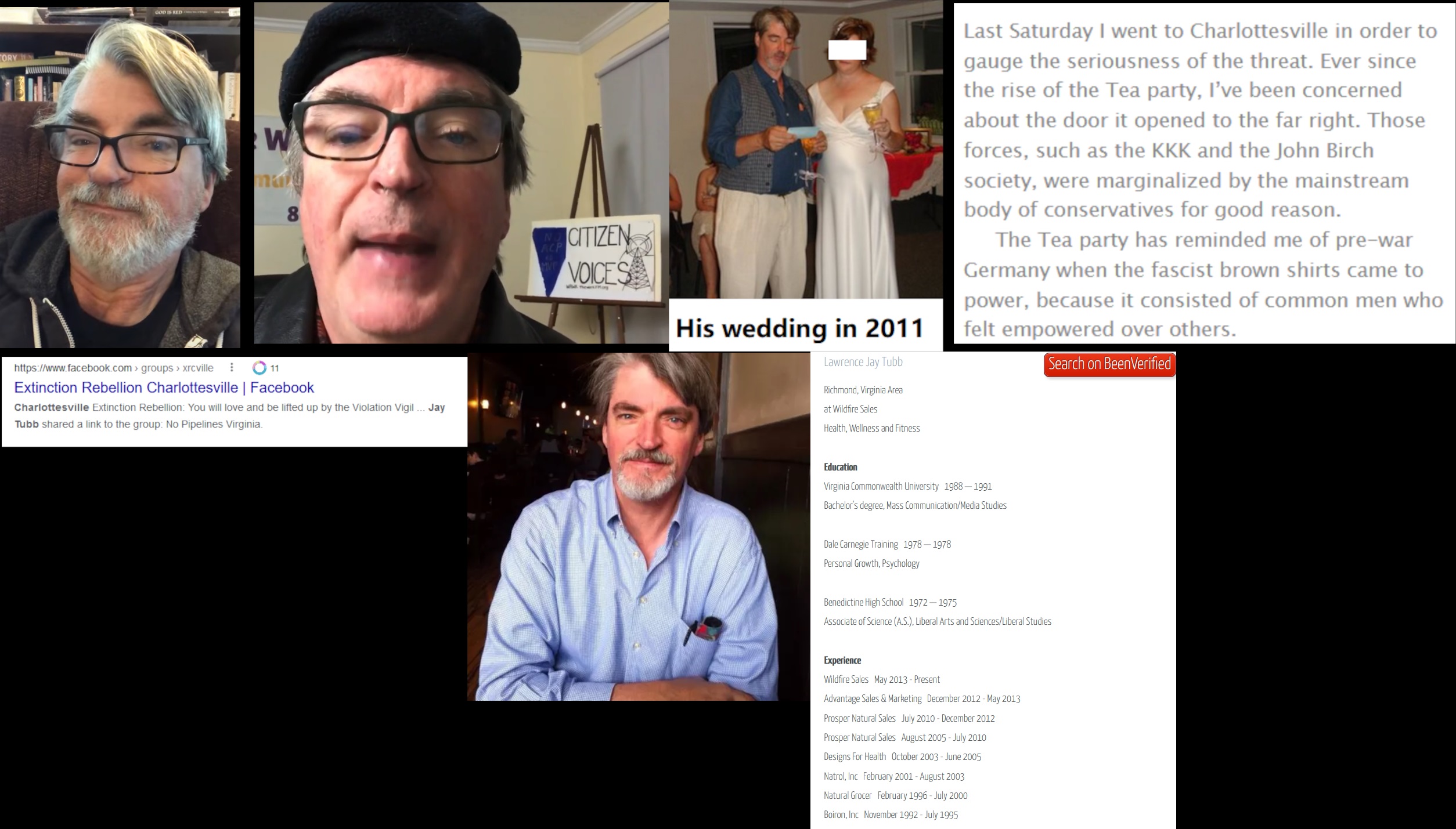 Lawrence Jay Tubb, who usually goes by "Jay", attended the Charlottesville counter protest. On his Youtube page, he shares footage of the rally that he took. Tubb was also present at a 2018 anti-Confederate statue protest in Richmond where he was quoted as saying, "I believe that this uprising of the CSA is thinly disguised racism and treason. These statues are a monument to that system. ‘Heritage not hate’ is their spin on their intolerance.” On his blog he compared the Tea Party to Hitler's Brown Shirts. He's an environmentalist who may be involved with the radical environmental group Extinction Rebellion. He's definitely pushing the Green New Deal. He's a grad of Virginia Commonwealth University and claims to be a poet but he works in sales. https://archive.vn/8awrg#selection-1255.17-1255.25 https://batjuby.wordpress.com/ https://www.pinterest.com/batjuby/protest/