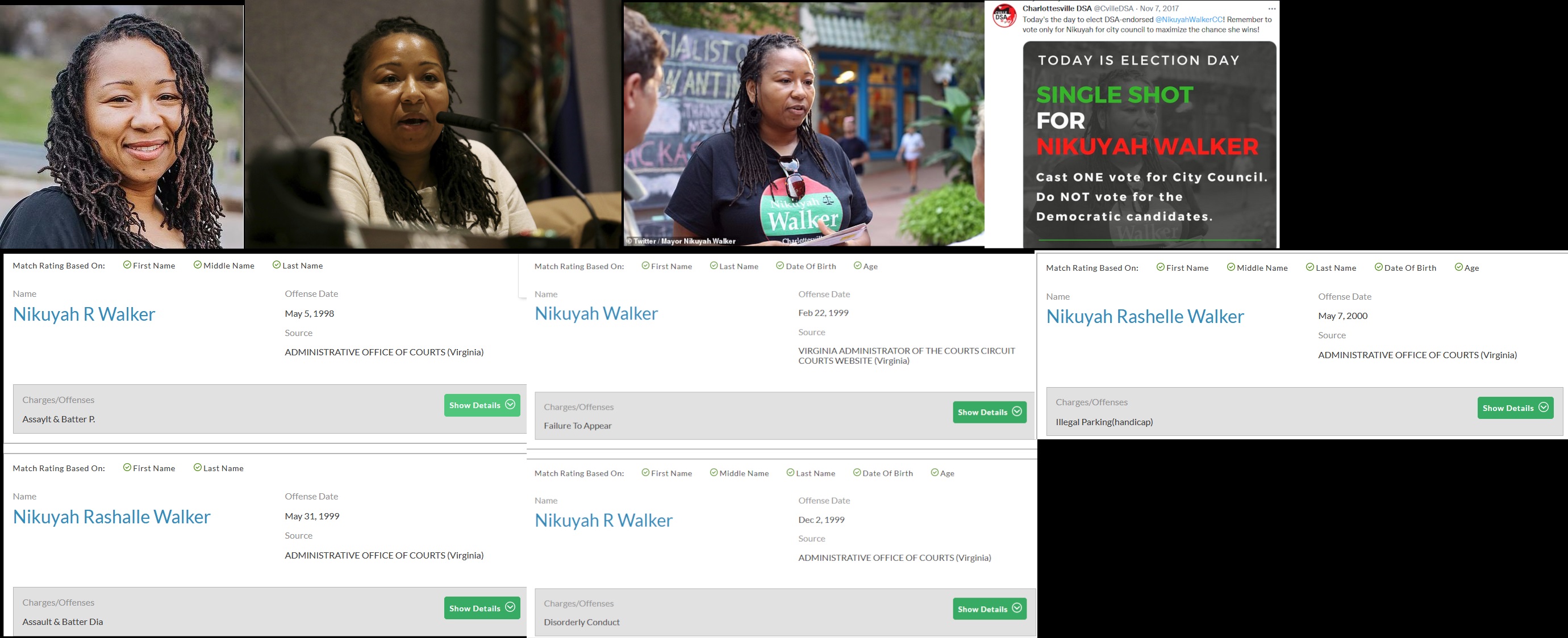 Nikuyah Rashelle Walker (DOB: 01/17/80) participated in the Unite the Right counter-protest in 2017. She was later elected Charlottesville's first black female mayor. Walker ran as an independent and was supported by the Democratic Socialists. She resigned under a cloud while she was under investigation for using her city credit card to buy personal gifts. She claimed she resigned in anger after the city's black female police chief was fired. In 2021, she wrote an explicit poem about her beloved city which included the classic lines, "It rapes you, comforts you in its s**t stained sheet and tells you to keep its secrets.” and, "It’s as if good ole Thomas Jefferson is still cleverly using his whip to whip the current inhabitants into submissiveness. . . . Charlottesville is anchored in white supremacy and rooted in racism." She was blasted by many people including rape survivors. Walker has numerous arrests including two assault and battery charges, disorderly conduct, failure to appear and cursing and abusing a police officer. She's special and thinks she can park in handicap parking spots and received a citation for the offense. She owns a small house in Charlottesville. https://archive.vn/cNx0I#selection-495.94-495.108 https://archive.vn/nZ5Sn, https://archive.vn/ivnuc