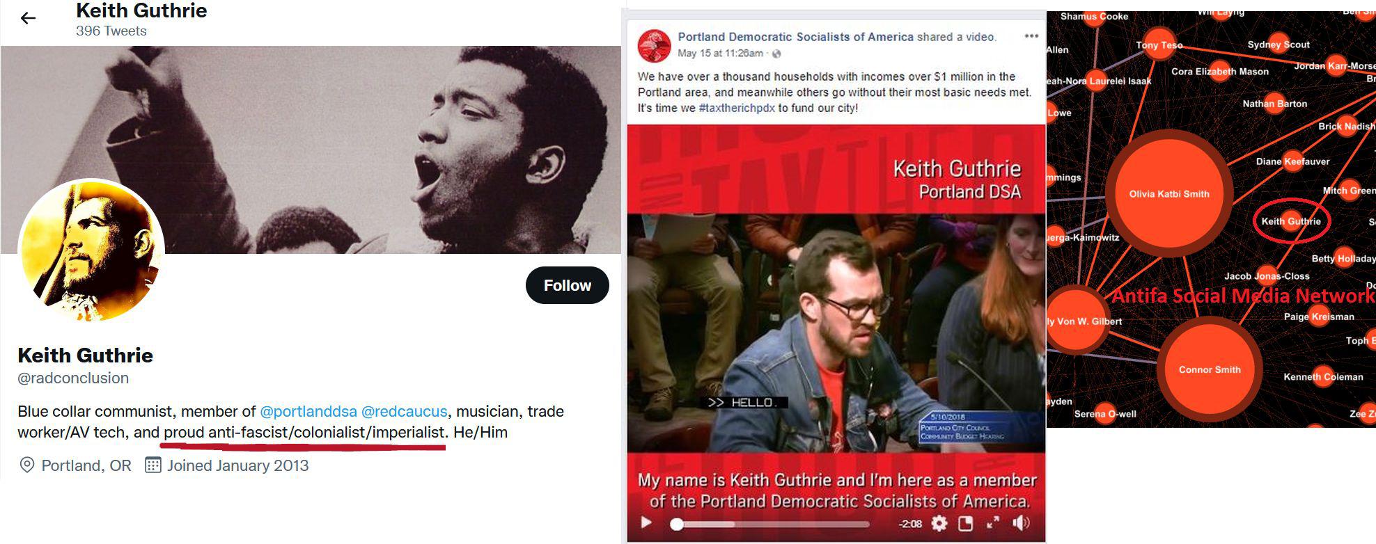 He's a member of the Democratic Socialists of America (DSA) who has social media ties to the Von Gilbert/Smith axis of the Portland Antifa network. Guthrie describes himself as a blue collar communist and proud anti-fascist/colonialist/imperialist on his Twitter feed. He was very active in the Portland "tax the rich" movement which sought to tax high earning residents at rates up to 8%. He was a member of the Portland DSA's steering committee but appears to have stepped down. He works as an HVAC technician and is believed to live in the Portland area. His age is a guess. https://archive.vn/0rL3h https://archive.vn/uwH6F https://archive.vn/yWiDc#selection-819.0-821.1