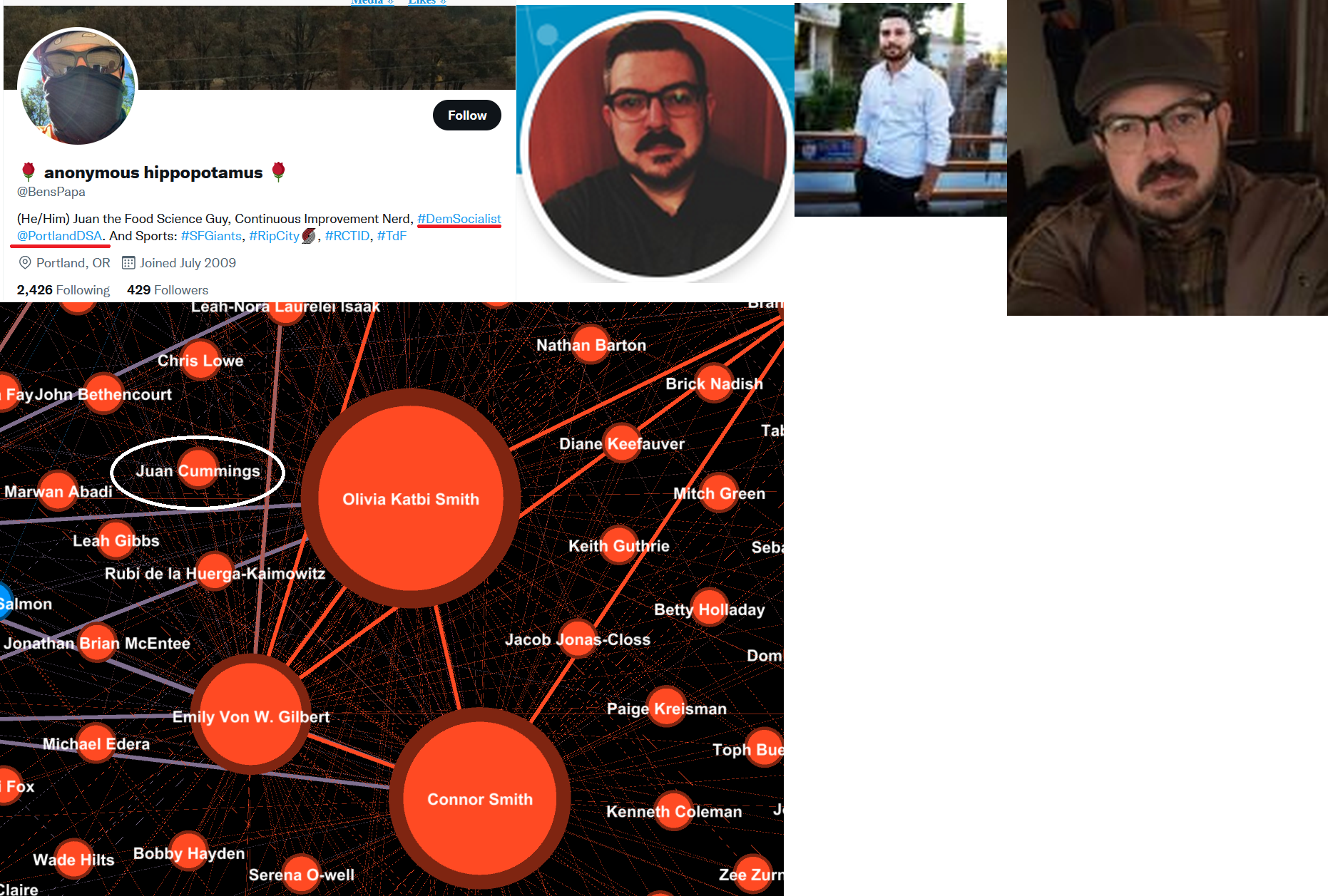 Juan Carlos Cummings (DOB: 10/31/80) is a member of the Portland chapter of the Democratic Socialists of America (DSA) who is allegedly connected on social media to the Von Gilbert / Smith gang in Portland's Antifa. He's kept out of trouble with no arrests for crimes over the last two decades. Cummings seems to work as a dairy manager, may have been a chef in the past and has a B.S. in Food Science from Oregon State. He's served for several years on the South Tabor Neighborhood Association board in Northeast Portland. Cummings seems to be into pro football and cycling. He has ties to Cali and Texas. https://archive.vn/yWiDc#selection-8227.0-8235.6 https://archive.vn/7l2uu