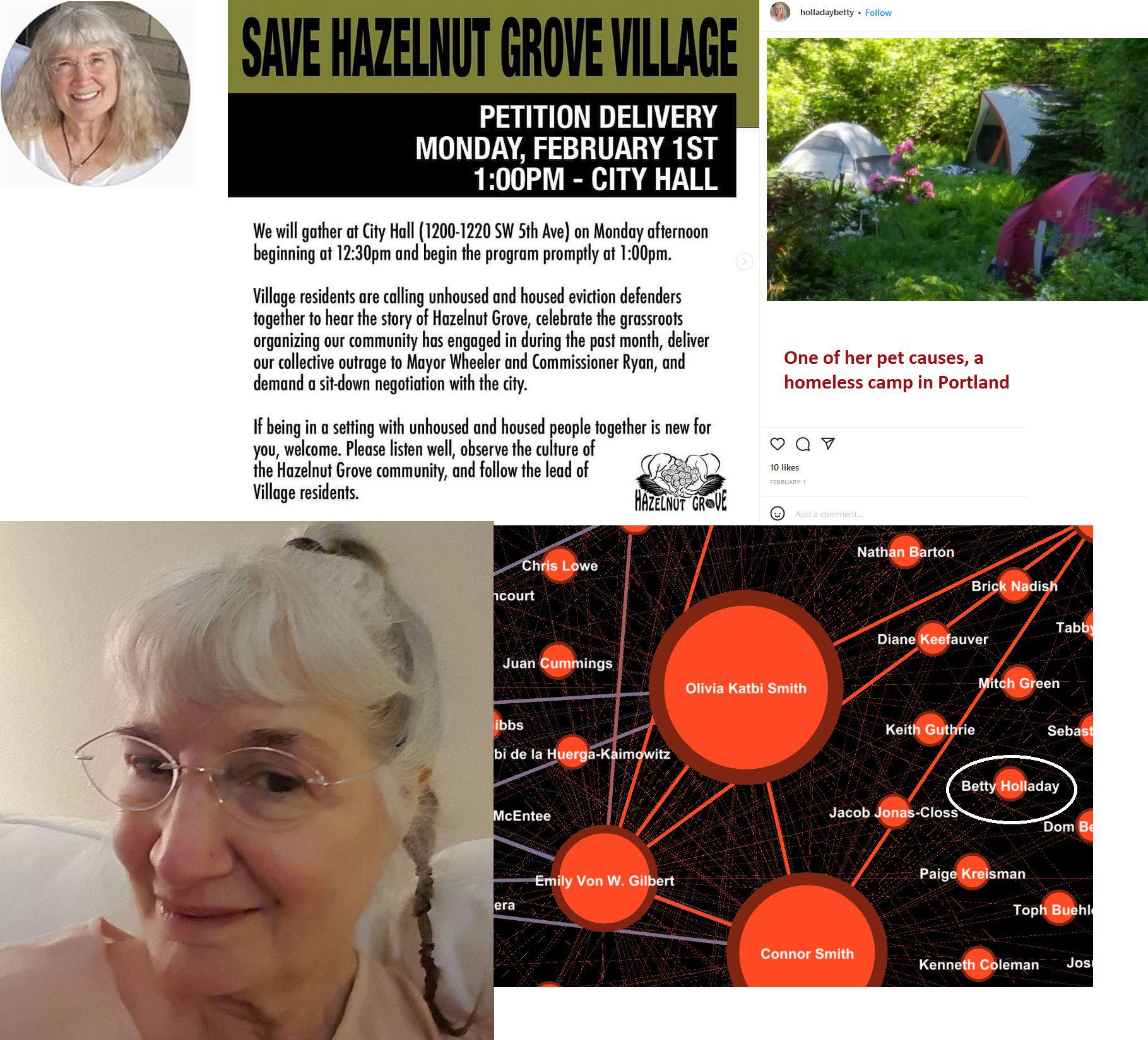 Betty Fances Holladay (DOB: 10/25/1949) is a member of Portland's DSA chapter who's connected on social media to the Von Gilbert/Smith Antifa crew of Rose City Antifa. She works at Oregon DHS as a Compliance Specialist. Holladay is also a registered lobbyist for Portland Tenants United. This granny likes to cruise in style; she was cited for illegal window tinting on her vehicle. Other than traffic violations she doesn't have a criminal record. Her Instagram feed doesn’t have much but there are several pictures related to the Hazelnut Grove homeless shanty-town so I infer it's an important cause to her. https://archive.vn/OjUSf https://archive.vn/7ox85 https://www.linkedin.com/in/betty-holladay-97798010 https://www.instagram.com/holladaybetty/