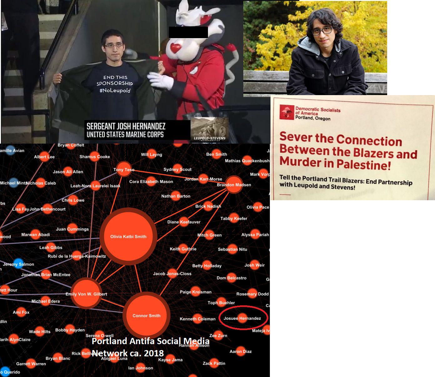 Josuee "Josh" Israel Hernandez (DOB: 01/10/86) is a Portland based writer who's still working on his first novel. He has social media connections to the Von Gilbert/Smith gang within Rose City Antifa. He's a former marine who was seduced by the dark side and is now a member of the Democratic Socialists of America (DSA). He's best known for his stunt at a Portland Trailblazer's game when he was honored for his military service during halftime at a game but he took a knee and unzipped his jacket to reveal a t-shirt critical of the gun manufacturer sponsoring the ceremony. Leftist hate the company, Leopold & Stevens, because it supposedly supplies sniper scopes to the Israeli military. Hernandez is the Vice President of The People’s Colloquium, a writers' collective. He holds a B.A. from the University of Oregon and an M.A. from Portland State. He appears to have had his Northeast Portland home obscured on Google Street View, probably because of the Trailblazers action. https://archive.vn/1cIdn https://archive.vn/7TS9w