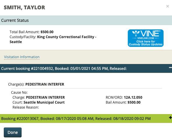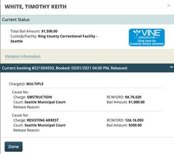 https://spdblotter.seattle.gov/2021/05/01/fourteen-arrested-during-saturday-marches/ Timothy Kieth White - Obstruction and resisting.