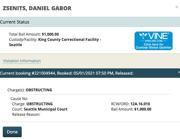 https://spdblotter.seattle.gov/2021/05/01/fourteen-arrested-during-saturday-marches/ Daniel Zsenits - obstructing. Likely goes by "Cassie"
