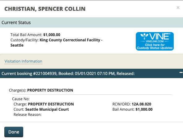 https://spdblotter.seattle.gov/2021/05/01/fourteen-arrested-during-saturday-marches/ Spencer Christian - property destruction