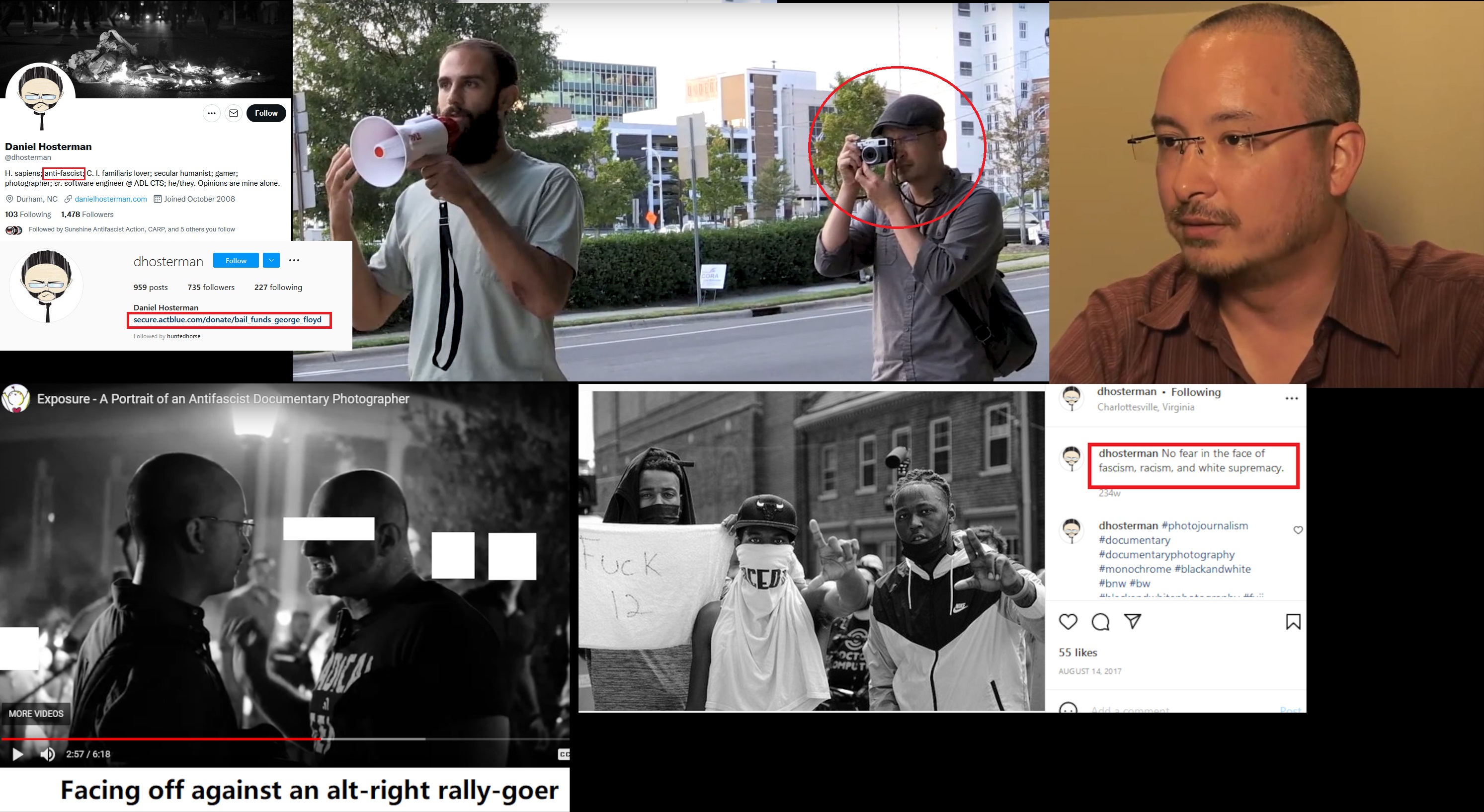 Daniel Adrien Hosterman (DOB: 03/14/77) is an antifascist who participated in the Unite the Right counter-protest and took photos. He engages in half-assed doxxing by associating protest photos with names. His Twitter feed shows he was present at Raleigh George Floyd protests/riots in May 2020. He works as a software developer for Cisco and semi-pro photographer who's had his photographs published in numerous national publications. Hosterman lives in a small house in Durham. https://www.danielhosterman.com/ https://www.youtube.com/watch?v=7KNoSgESoIs&t=166s&ab_channel=M.Xia