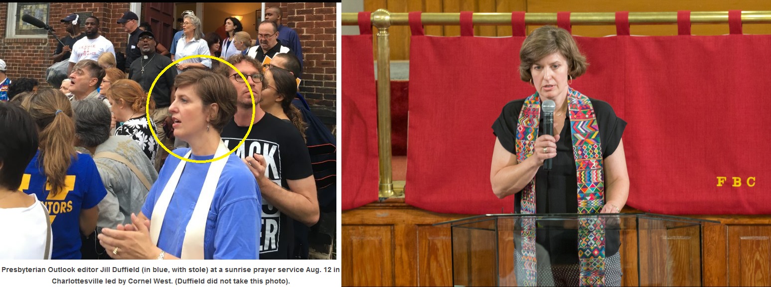 Jill J. Duffield (DOB: 02/23/69) participated in the Unite the Right counter-protest in 2017. She's an ordained Presbyterian minister and the publisher of the Presbyterian Outlook and doesn't appear to be attached to a parish. I guess the Presbyterian Pope lets her publish her newsletter as her ministry. Duffield lived in Charlottesville at the time of the protest but moved to Greensboro, North Carolina in 2020 where she lives with her husband in a nice house. She earned a BA in history from the University of North Carolina at Greensboro and a Masters of Divinity from Union Presbyterian Theological Seminary and a Doctorate from Austin Presbyterian Seminary. https://archive.vn/lQDb6