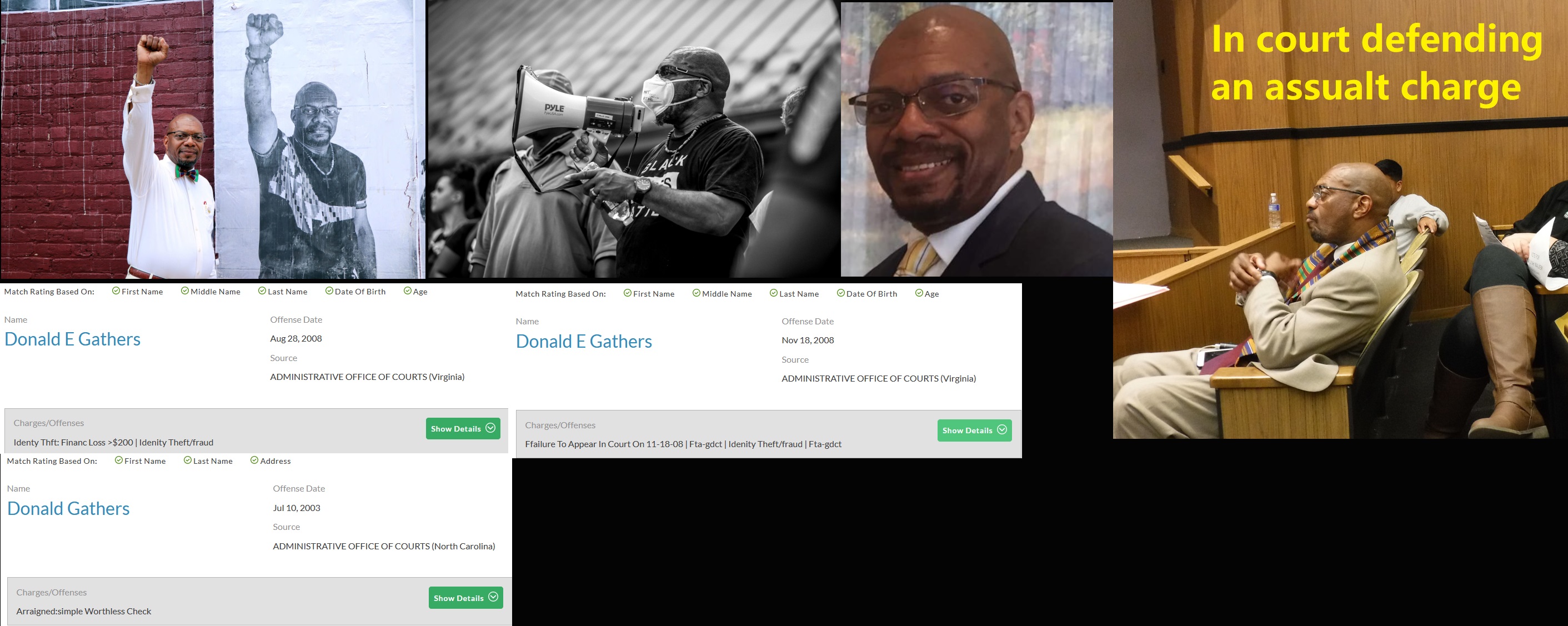 Don Edward Gathers (DOB: 02/26/59) is an activist who participated in the the Charlottesville Unite the Right counter-protest. He's also active in Black Lives Matter and co-founded the Charlottesville chapter. He ran for Charlottesville City Council in 2019 but withdrew from the race after a Florida man made online threats against him. Gathers works as an organizer with the Charlottesville Public Housing Association of Residents. He's a deacon at the First Baptist Church.The good deacon has a 1996 bankruptcy and numerous civil judgements against him. He was evicted in 2007. He's been convicted for identity theft and he was cited for failing to appear at a hearing. He also has arrests for writing a worthless check and one for assault and battery for grabbing a woman's breast. He lives in a nice rental house in Charlottesville. https://www.dailyprogress.com/news/state/gathers-delays-start-of-his-council-campaign-resigns-from-police/article_9ab080c8-1390-11e9-b06a-ab7133e109d5.html https://archive.vn/Xao3L, https://archive.vn/uYMhW