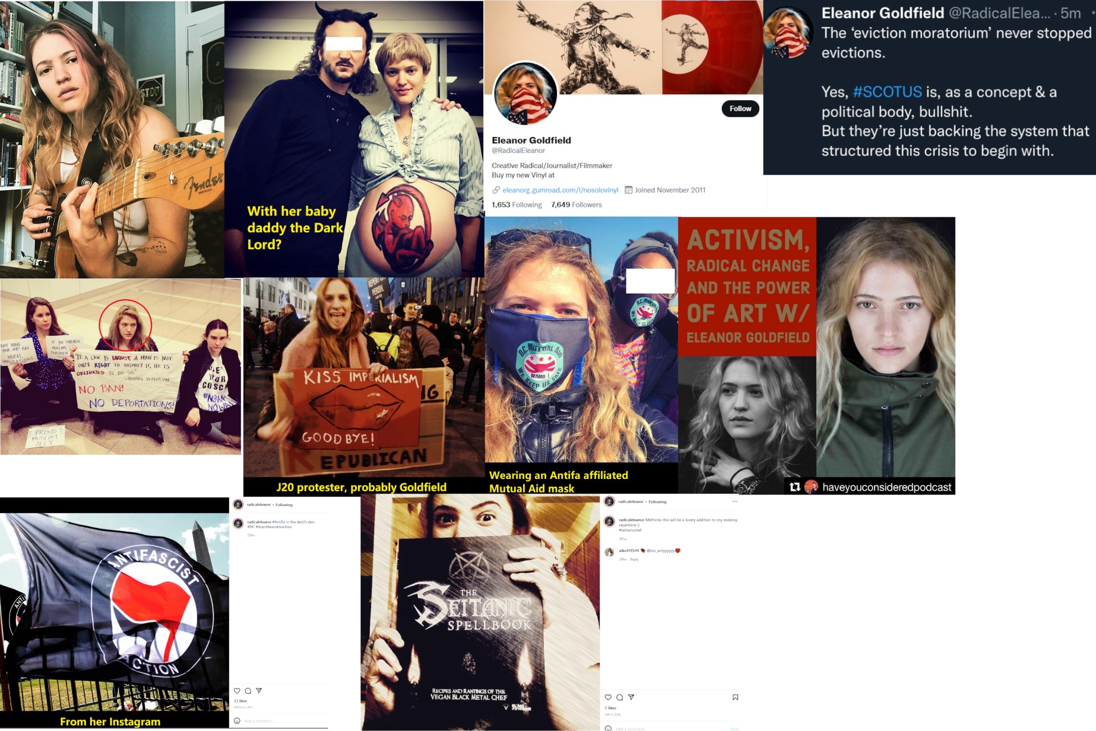 Eleanor Ingrid Sarah Goldfield (DOB: 12/06/86) is a musician and documentary film maker who was one of the Disrupt J20 organizers. She took a lot of photos of the riot and was also seen holding a sign in one photo. She also attended the 2017 Charlottesville Unite the Right counter-protest. She's Jewish but "anti-Zionist".Goldfield is affiliated with the far-left group DC Mutual Aid. She founded the rock band Rooftop Revolutionaries but no longer fronts the band. Goldfield claims to work as a journalist but her journalistic impartiality is in doubt given her radical advocacy. She's probably a radical who wears a fake press badge so it's less likely she'll be arrested. Goldfield lives in and apartment in the Lanier Heights neighborhood in Washington, DC. https://archive.is/26HHj, https://actout.libsyn.com/, https://commoncensored.libsyn.com/ [email protected] https://linkedin.com/in/eleanorgoldfield https://www.youtube.com/playlist?list=PLrJSD42IiHDuykVDv10IFU5GQVKh5hdrv https://youtu.be/Qef39yp5V8E?list=PLrJSD42IiHDuykVDv10IFU5GQVKh5hdrv&t=20