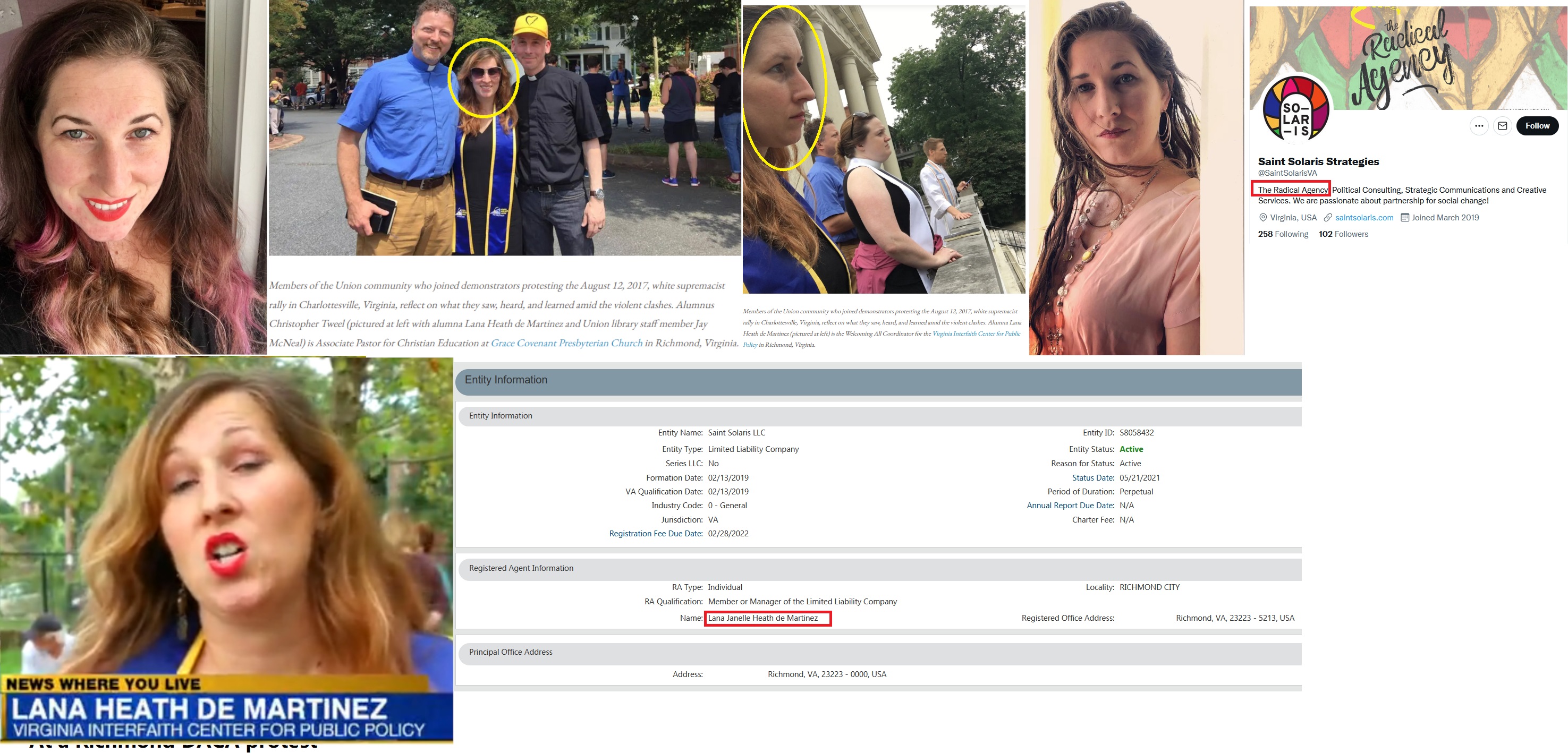 Lana Janelle Heath de Martinez (DOB: 05/02/84) participated in the Charlottesville counter-protest with the clergy. de Marinez is active in the illegal alien sanctuary movement that hides illegals illegally in churches. She's quoted as saying, "White supremacy is at the root of economic injustice, anti-immigrant sentiments, anti-Semitism and Islamophobia.” de Martinez may be an ordained minister but it's unclear which faction she belongs to or if she's attached to a parish. She currently works for Saint Solaris which seems to be some sort of left-wing consulting agency. de Martinez has a Masters in Divinity from Union Presbyterian Theological Seminary. She lives in a nice little rental house in Richmond. https://archive.is/G8VYH#selection-385.0-385.22 https://archive.is/VjCuD, https://archive.is/7A9bP https://www.linkedin.com/in/lana-heath-de-martinez-2b006b1b