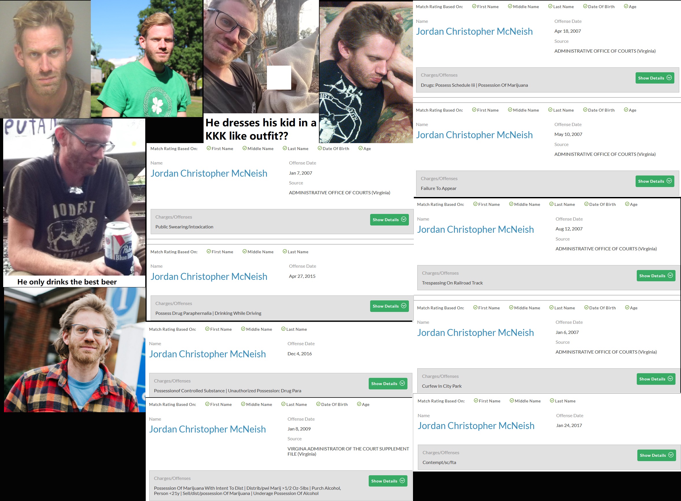 Jordan Christopher McNeish is a pothead who participated in the Charlottesville Unite the Right counter-protest. McNeish was arrested for spitting on rally organizer Jason Kessler in a park and was charged with disorderly conduct. McNeish was previously occupied with Occupy Charlottesville in the early 2010s. He seems to have had a substance abuse problem when he was younger with many drug and alcohol related arrests. McNeish probably dealt pot, he has an arrest for possession with intent to distribute. He also has arrests for trespassing, curfew violation, contempt, failure to appear, drinking while driving and possession of drug paraphernalia. He's still involved with drugs, at least with overdose prevention meds. He held a GoFundMe campaign to raise money for Naloxone. He's advocated at Charlottesville City Council meetings for marijuana legalization. It's uncertain whether he lives in Afton or Scottsville, Virginia but they're both close to Charlottesville. https://archive.vn/cMwDo, https://archive.vn/pl6l5, https://archive.vn/PhHDL, https://archive.vn/EXNRm https://archive.vn/gxnJq#selection-3719.74-3719.88 https://www.youtube.com/watch?v=Ycjenr06CXk&ab_channel=gfyuifgtviftgiwsfisftiiy