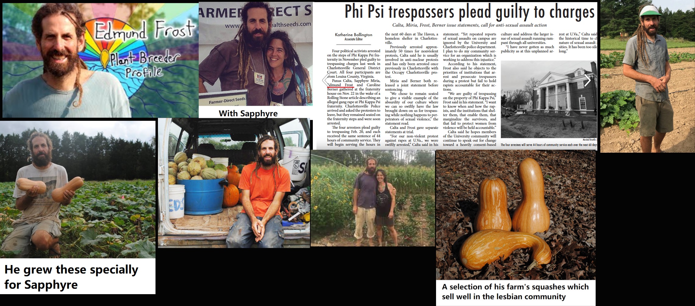 Edmund Nicholas Frost (DOB: 01/30/77) was allegedly one of the organizers of the Charlottesville Unite the Right counter protest. Our group can't find any articles directly linking him to the counter-protest, but given his history of left-wing activism, it's highly probable he was at the rally. He attended a 2014 illegal alien rally in D.C. In 2015, he was arrested with Sapphyre Miria (https://antifawatch.net/ViewReport/55f148de) and two others for trespassing at a UVA fraternity house that had been accused of gang rape by Rolling Stone. Frost was sentenced to 44 hours of community service for his crime. He's an organic farmer who co-manages Twin Oaks Seed Farm with River Oneida. He also owns Common Wealth Seed Growers LLC which is probably connected to Twin Oaks. Frost lives at Mimosa Intentional Community. He may be in a long-term relationship with Sapphyre Miria, another radical who participated in the Unite the Right protests. The pair have worked together for years. The hippy communes he's associated with are all in Louisa County which is near Charlottesville but he has ties to an address near Lynchburg, Virginia. http://archive.vn/BOczH, http://archive.vn/dl0YF, https://archive.is/r8MOH, https://archive.is/NCS6w https://archive.is/jfdYM#selection-933.0-933.12 https://archive.is/OB1a1#selection-5353.7-5353.19 https://www.youtube.com/watch?v=kJoD0bCfSgQ&t=1s&ab_channel=UtopianSeedProject