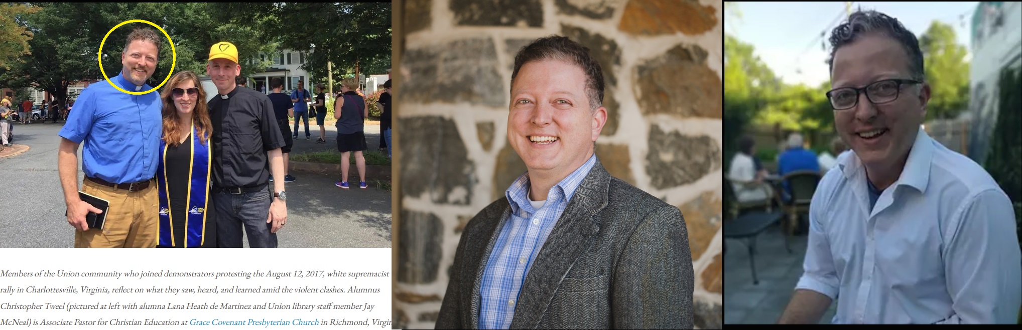 Christopher Matthew Tweel (DOB:10/13/77) participated in the Charlottesville Unite the Right counter-protest with other clergy and claims to have been "at the barricades". He's an ordained Presbyterian minister. The good reverend doesn't seem to think traffic laws apply to him. He has many traffic/vehicle related violations. He's of Scottish/Arabic (Braveheart meets ISIS?) descent and earned a Masters of Divinity at Union Presbyterian Seminary. He's written several religious books that you can find on Amazon. Tweel is the pastor at Three Chopt Presbyterian Church in Richmond. Although he's married with children and presumably straight, Tweel and his wife donated money to a group of gay Presbyterians. https://archive.vn/VjCuD, https://archive.vn/5KeBz, https://archive.vn/obEgB, https://archive.vn/Kmu6q https://www.revtweel.org/ https://web.archive.org/web/20201019145623/https://mlp.org/wp-content/uploads/2020/06/MLP-Annual-Report-2019-web-friendly.pdf