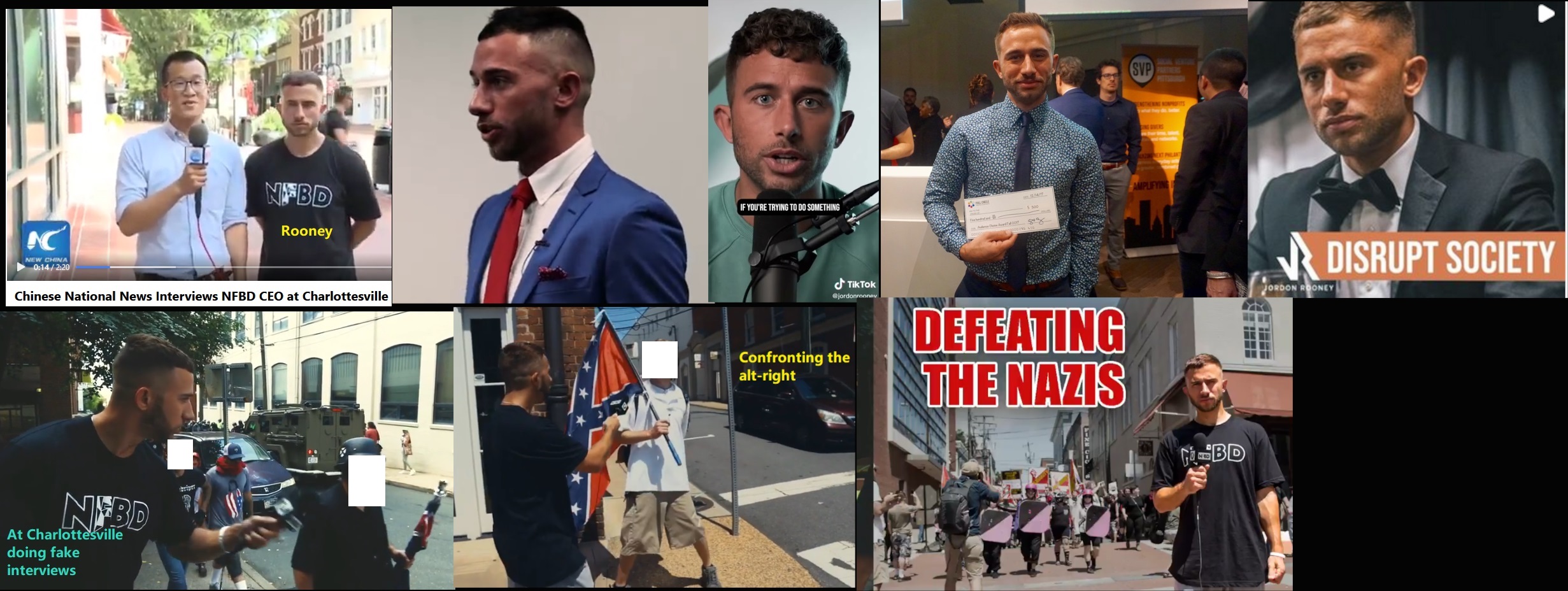 Jordon Richard Rooney (DOB: 01/12/90) participated in the Charlottesville counter-protest. He traveled to Charlottesville with his friend and collage football teammate Dave Wright. They were two of the people who filmed the aftermath of the car ramming attack. At the rally, he was interviewed by the official Chinese communist media organization Xinhua. He claimed in the interview that only white people are violent. Rooney was also seen harassing members of the alt-right at the rally. Rooney runs a Pittsburgh area non-profit known as "Never Fear Being Different", or NFBD, with his bud Dave and he works as a sports personal brand coach, claiming to be the first NCAA Division I personal brand coach. He played defensive back for Westminster College and claims to have played "professional" football (American) in Brazil, Serbia and Poland. He led his team to the Serbian version of the Super Bowl, the Slopvka Bolkska in 2015 (not really). Somewhat ironically, Rooney majored in criminal justice at Westminster college. He lives in the Pittsburgh area. P.S., his parents really did misspell his first name. https://archive.vn/MP3sc, https://archive.vn/pDXwV, https://archive.vn/3RIvz https://www.facebook.com/JordonRoo/videos/chinese-national-news-interviews-nfbd-ceo-at-charlottesville-p/1979977545619529/ https://wikitia.com/wiki/Jordon_Rooney