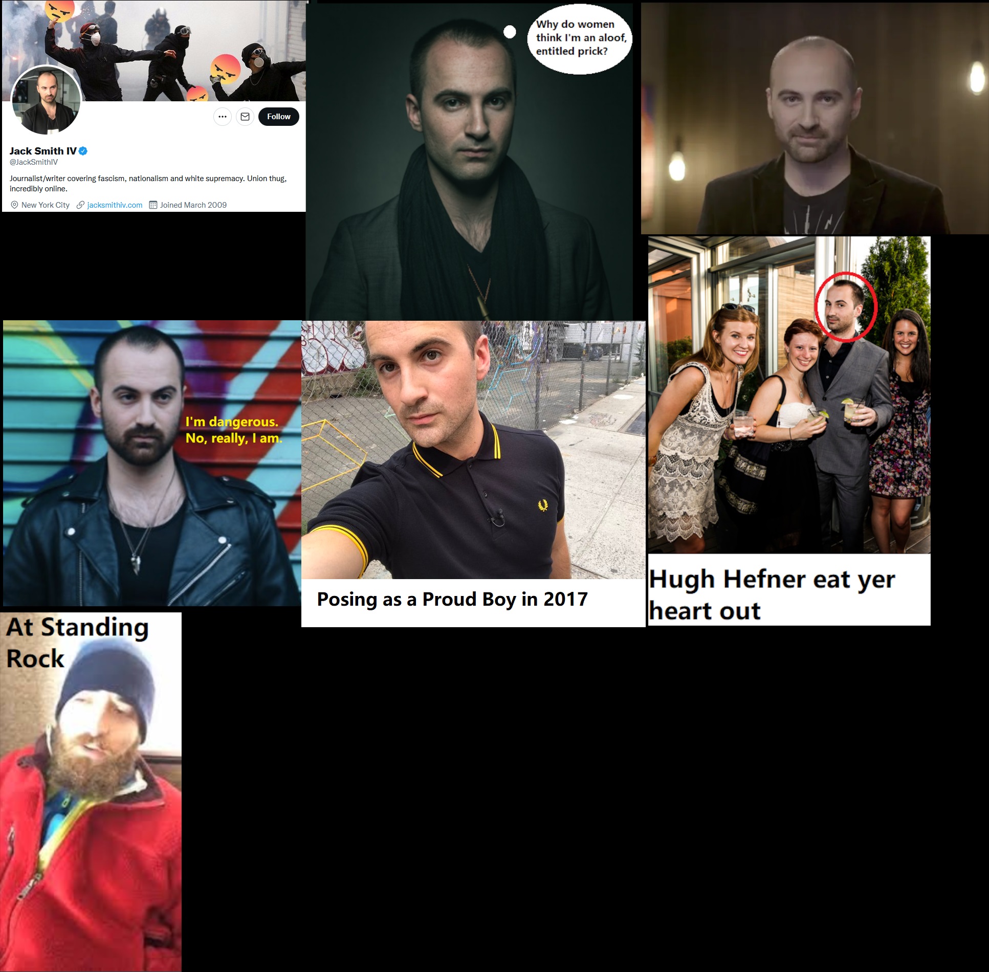 Jack Smith IV is a journalist who attended the Charlottesville Unite the Right counter-protest. Prior to Charlottesville, he was arrested for obstruction at the Standing Rock protests. He claims to cover the far-right and white supremacy and appears to have used questionable tactics. He's seen in one photo posing as a Proud Boy. It appears that he was trying really hard to make Jack Smith V. He was fired from his job at the left-wing website Mic for abusing women. According to the media outlet Jezebel, "All of these women accuse Smith of behavior they variously describe as emotional abuse, manipulation, and gaslighting. Three of these women say independently of one another that these tactics led to coercive sex.” He's described by the women who know him as, "Aloof, entitled, and kind of a prick." His Twitter feed is strangely inactive for a journalist with no Tweets since 2019. Smith lives somewhere in New York City, probably in Manhattan where the media types usually live. https://archive.vn/HYTyA, https://archive.vn/uqYkQ https://www.youtube.com/watch?v=Apu_i9KAmoE&ab_channel=TheOpenMind