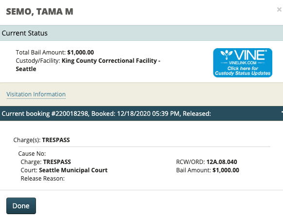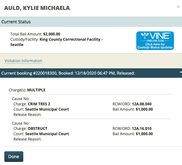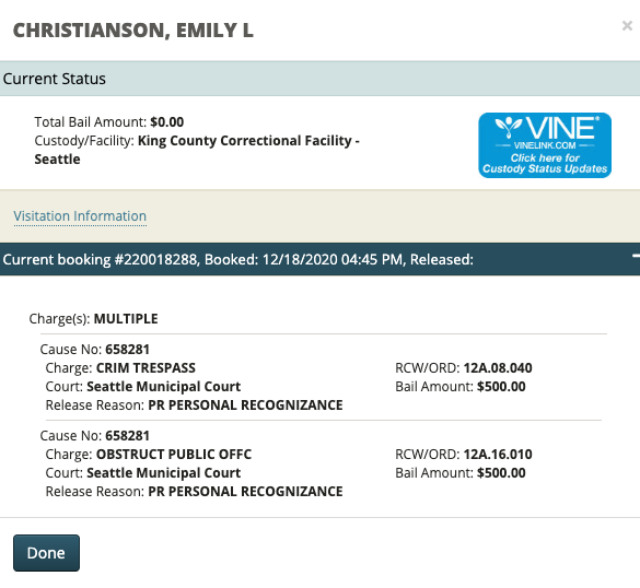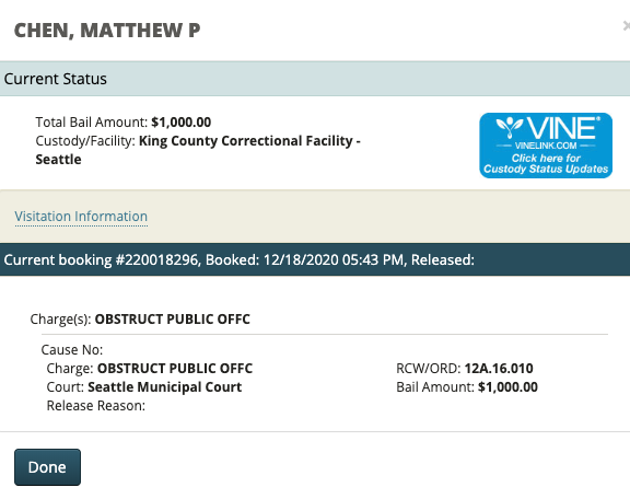 Chaz 2.0 Seattle - Charge: FAIL TO DISPERSE Charge: OBSTRUCTION https://spdblotter.seattle.gov/2020/12/18/police-assist-seattle-parks-department-in-cal-anderson-clean-up-live-updates/