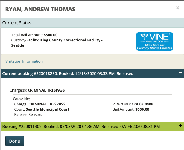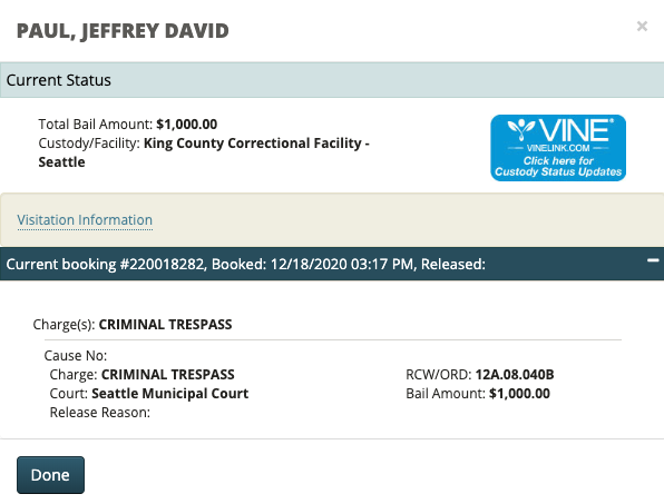Jeffrey Paul - Criminal trespass. Likely the individual from this article who's suing Trump/DHS for getting owned by the Feds during the #Portland riots https://oregonlive.com/crime/2020/07/seattle-man-hospitalized-after-protesting-in-portland-sues-president-trump-homeland-security-secretary.html Chaz 2.0 Seattle https://spdblotter.seattle.gov/2020/12/18/police-assist-seattle-parks-department-in-cal-anderson-clean-up-live-updates/