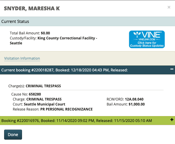 Chaz 2.0 Seattle - Charge: CRIMINAL TRESPASS Charge: OBSTRUCT PUBLIC OFFC https://spdblotter.seattle.gov/2020/12/18/police-assist-seattle-parks-department-in-cal-anderson-clean-up-live-updates/