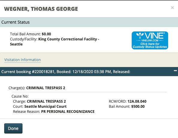 Chaz 2.0 Seattle - Charge: CRIM TRESS https://spdblotter.seattle.gov/2020/12/18/police-assist-seattle-parks-department-in-cal-anderson-clean-up-live-updates/