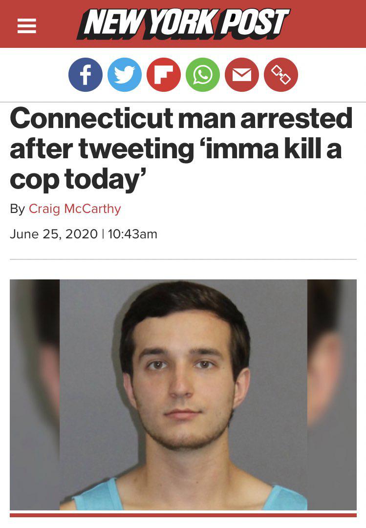 https://whdh.com/news/connecticut-man-charged-with-social-media-threat-to-shoot-police/ Alexander Hassinger, 24, was arrested at his Newtown home Wednesday evening on harassment and breach of peace charges.