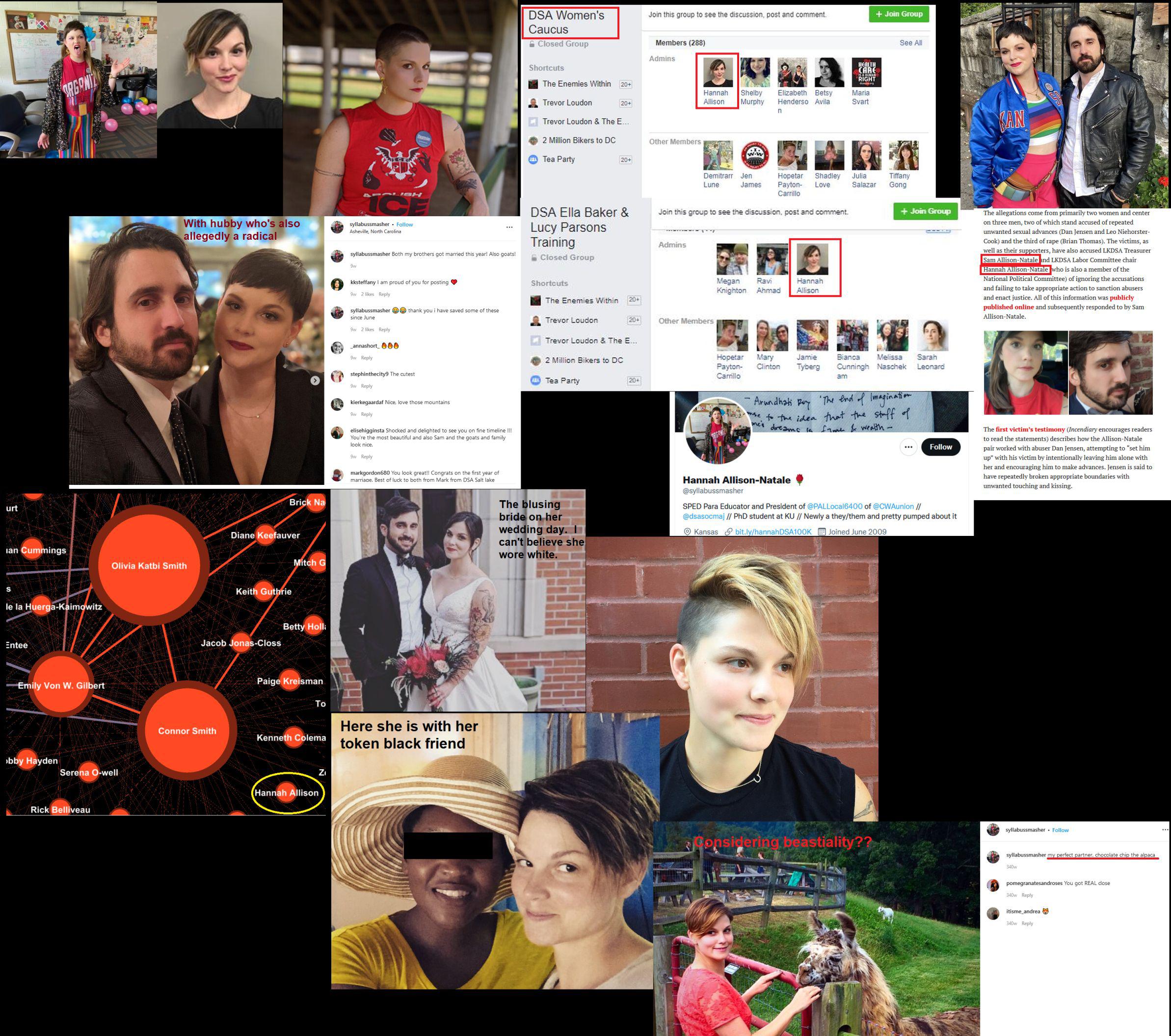 Hannah Ross Allison (DOB: 01/17/87), who often goes by Hannah Allison-Natale, is allegedly connected on social media to the Von Gilbert / Smith wing of Rose City Antifa. There are several "Hannah Allisons" who fit the description including one who's a lawyer for illegal aliens in Austin but Hannah Ross Allison is a prominent DSA organizer and is the most likely candidate. As of 2021, she was a grad student and teaching assistant at the University of Kansas. She's also active with Socialist Majority. Additionally, she appears to run a training course for radical students known as Smashtheysylabus (https://smashthesyllabus.com/community-organization). Allison signed a petition penned by radical feminists urging Biden to drop out of the 2020 election due to allegations of sexual misconduct. Her husband, Sam, is also a DSA member and the pair have been accused of sexual abuse as well as aiding other sex abusers within DSA. Note that neither have been charged with any sexual crimes. She implies on her Twitter feed that she's transitioning to some sort of "non-binary" so I guess Sam isn't giving it to her the way she likes it. In recent years, she seems to have changed her "look", adopting a more radical hair and clothing style. Allison has a few brushes with the law but nothing major. She probably did her undergrad work at NC State. She lives in a non-descript home in Lawrence Kansas with her hubby. https://archive.vn/3qu90, https://archive.vn/Y5BQv, https://archive.vn/3qu90, https://archive.vn/Y5BQv, https://archive.vn/oZTQ7, https://archive.vn/1IQ4p, https://archive.vn/0Sesy https://web.archive.org/web/20220108124245/https://forums.somethingawful.com/showthread.php?threadid=3808020&userid=0&perpage=40&pagenumber=892