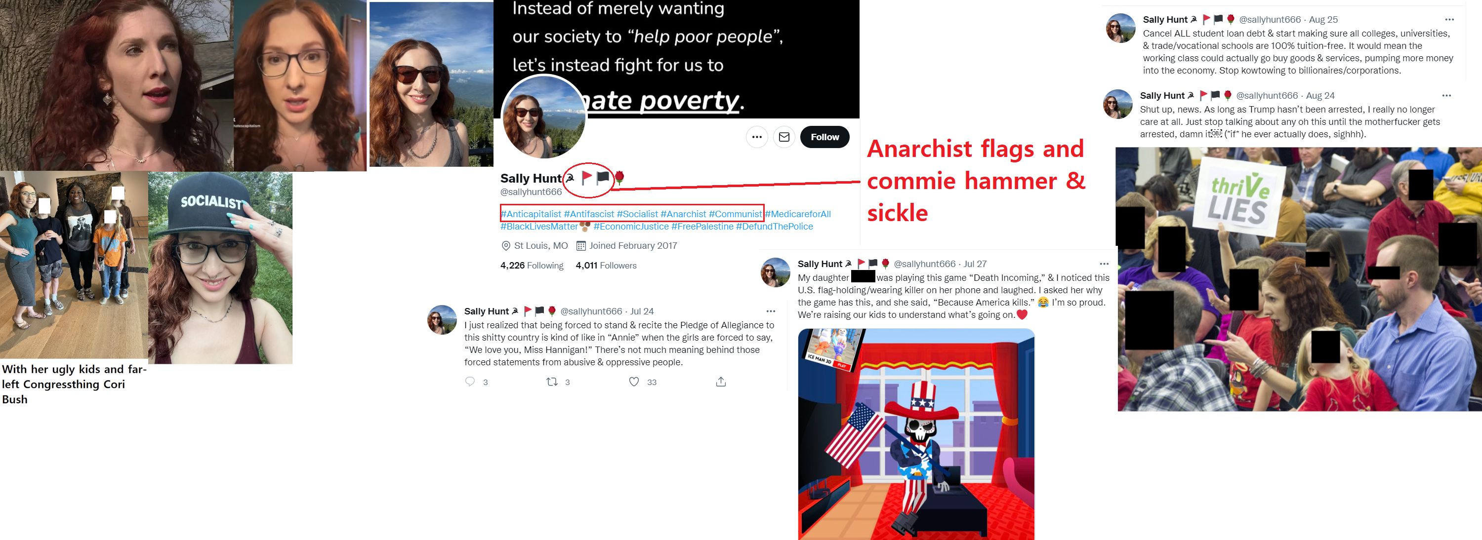 She's an atheist and a local left-wing celebrity who flies the red and black flags of anarchy on her twitter account which also contains the communist hammer & sickle. She identifies as an anti-capitalist, anti-fasicst, socialist, anarchist, communist and BLM supporter. In 2017, she was kicked out of a St. Charles, Missouri school board meeting on sex-ed. She has three kids, but they attend schools in the Parkway district. Hunt was sitting illegally in a section reserved for St. Charles parents and had to be dragged out by the police. She seems to enjoy sticking her nose into other town's business. Hunt was also dragged out of a Wentzville city council meeting while protesting an "In God We Trust" display. She later teamed up with the ACLU to sue the council. Hunt lives in the St. Louis suburb of Maryland Heights so I'm not sure what business it is of hers what another town does. https://archive.ph/AW9rS https://archive.ph/BSo2k https://www.youtube.com/watch?v=qrEc8GWtjM0 https://www.etsy.com/shop/SallyHuntStudio