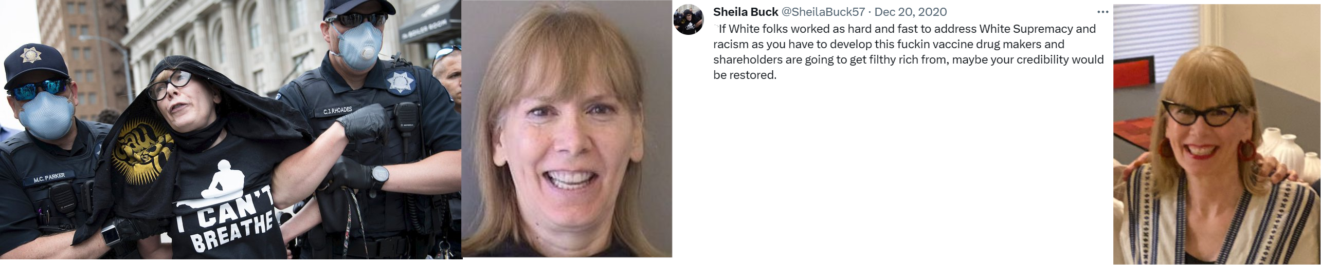 Sheila Sharp Buck (born Jun. '57) is a granny who hates Trump. She was arrested after refusing to leave a road in a secure area during Trump's Tulsa rally in June 2020. Buck had infiltrated the secure perimeter, but she was recognized by a Trump staffer who asked the Secret Service and Tulsa police to remove her. She was wearing an "I can't breathe" t-shirt when arrested. Her charges were later dropped and she filed a $1 mil. lawsuit against the city. Buck worked as a Catholic elementary school art teacher. She claimed she was moving out of Tulsa due to the publicity she received but she doesn't appear to have moved recently. Buck lives in an apartment in the Riverview neighborhood of Tulsa. https://archive.ph/1b928, https://archive.ph/Ok9zU