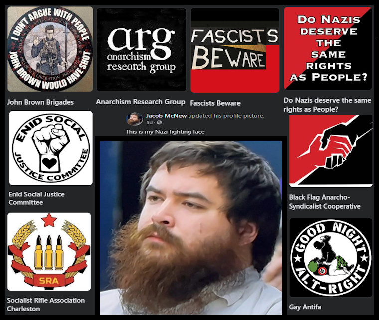 Jacob McNew, an anarchist hydroponics major currently living in Stillwater, Oklahoma, is a supporter and mouthpiece for the Enid Social Justice Committee, an Antifa cell dedicated to unseating a conservative politician who marched at Cville in 2017. He currently lives in Stillwater, Oklahoma, but has ties to Enid. He is a card-carrying member of the IWW and works/studies in the hydroponics industry. An examination of McNeal's Facebook page contains a trove of evidence that showcases his support for the anti-White extremist movement, commonly referred to as Antifa. Online, McNew has endorsed the Antifa-adjacent Socialist Rifle Association, the Black Flag Anarco-Syndaclist Cooperative, the Oklahoma branch of the terror-linked Anti-Racist Action, and the UK-based "Anarchism Research Group." Additionally, he has "liked" a page called the John Brown Brigades, an affinity group dedicated to "armed insurrectionary anti-racism." It's also a propaganda wing for the heavily armed and terror-linked John Brown Gun Club (JBGC). https://justicereport.news/2024/03/21/antifa-and-media-are-subverting-democracy-in-enid-oklahoma/